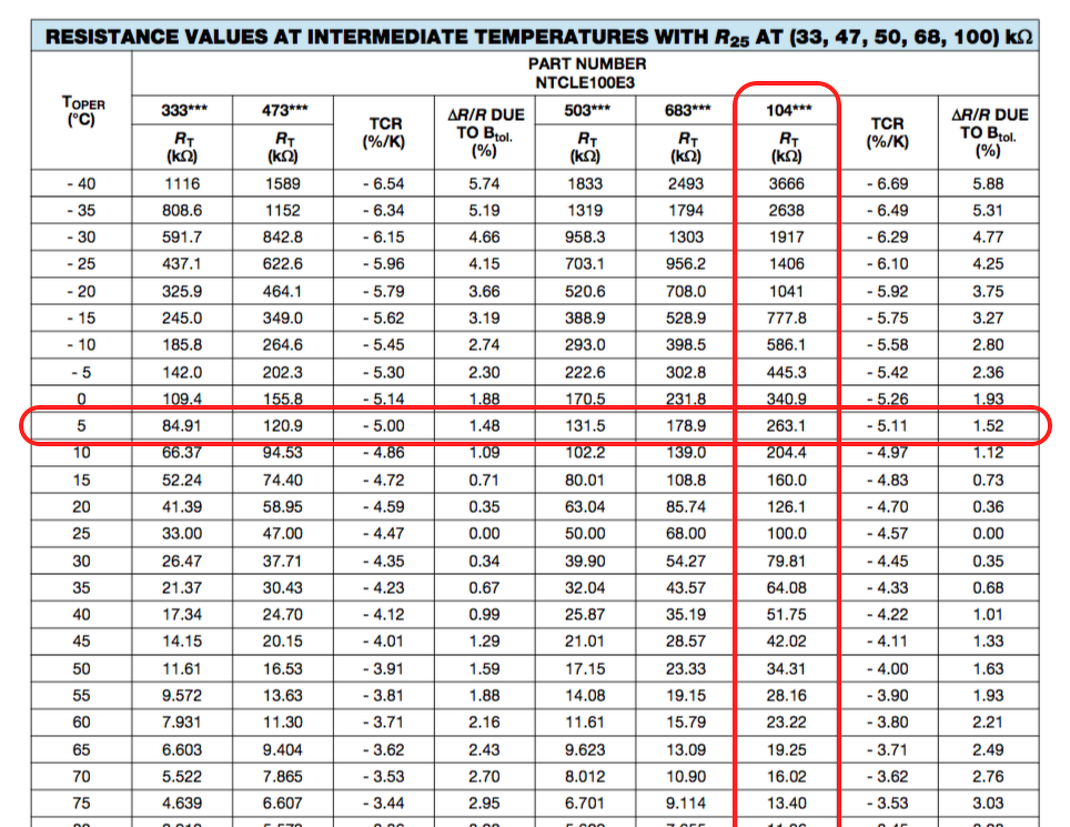 Te kérdezted a 100 kΩ-os NTC ellenállásást 5 °C-on. Bal szélső oszlop a hőmérséklet, a jelölt függőleges oszlop pedig a 100 kΩ-os NTC adatai.