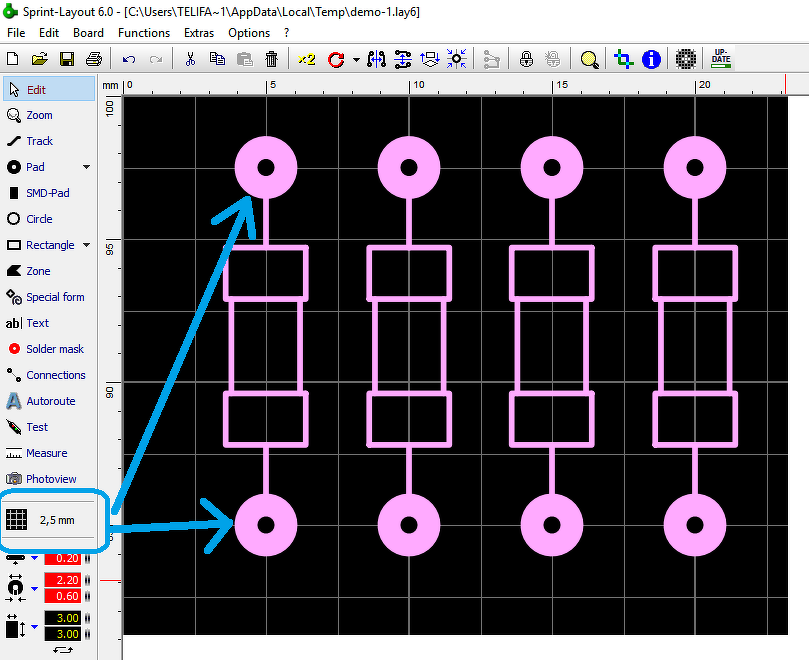 Kokozó demonstrációs ábráján az ellenállások pad-jei 2,5-es raszteren vannak, amit egy 1,27 mm-es környezetbe illesztett be. Ha most ezt a környezetet átállítom 2,5mm-re, vagy ennek egész számú töredékére, akkor az alkatrészek szépen sorba rendeződnek, hiába vannak elfordítva.