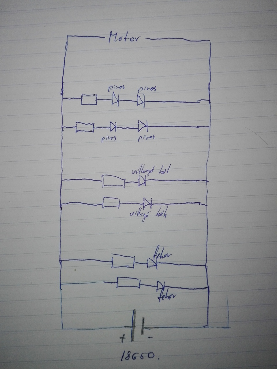 Tehat, azt hiszem helyesen rajzoltam le a kapcsolasomat. A modell hatso lampajanal magyon kicsi volt a hely, ezert smd "szeru" ledet vasaroltam. 2.5x2.5mm a led, es nagyon vekony tu labai vannak amik oldalra allnak. Na, ebbol sorosan kotottem kettot, esztetikai okok miatt. Az itteni segedprogrammal valasztottam neki ellenallast- osszeforrasztas utan, kiprobaltam az egesz "fuzert" es mukodott. Azt akarom kerdezni, hogy a rajz alapjan akkor jol csinaltam? Azt elmondod, hogy miert kell, hogy a korlatozo ellenallasra is jusson valamennyi feszultseg? Hogy a led melyik kivezetesere kotom az ellenallast, az szamit?