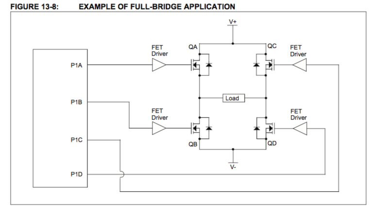 Elég két, külön is vezérelhető PWM kimenet. Az egyik a bal alsó, a másik a jobb alsó FET-et vezérli. Pl.: