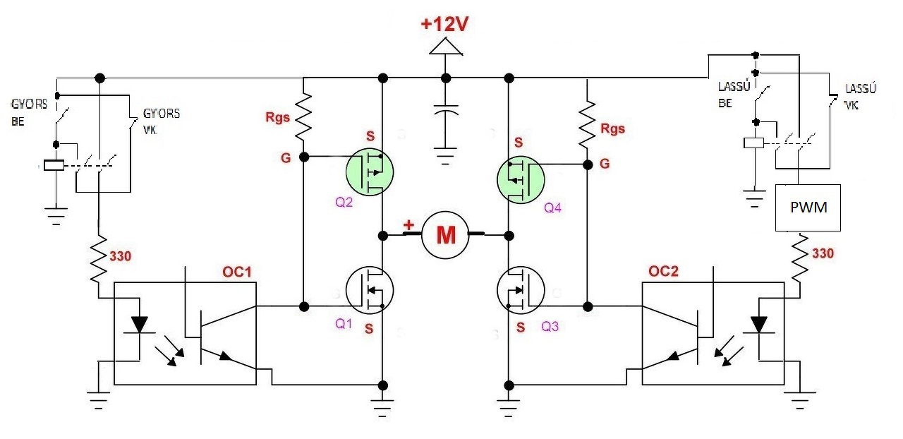 Kinyitod a jobb felsőt, a bal alsónak adsz PWM jelet, ahogy szeretnéd. Ha a PWM kitöltés 100 %-os, akkor a kimenet gyakorlatilag magas szinten van. A kimenet használható gyors és lassú üzemhez is. Ha a másik két FET-et verérled, a forgásirány megfordul. Ennyi, nem több. Ez kb. gyerekjáték kategória Arduino-val is. Csak annyit kell megoldanod, hogy az egymás felett lévő FET-ek ne tudjanak egyszerre nyitni. A FET jobban bírja a kiképzést, mint a relé, pláne nagyobb áramok esetén. Mivel a rendszer eleve 12 V-os, nagyon variálni sem kell, jó lesz négy egyforma, N csatornás FET is. P csatornások eleve gyengébb paraméterekkel rendelkeznek, sokkal kevesebb is van belőlük.