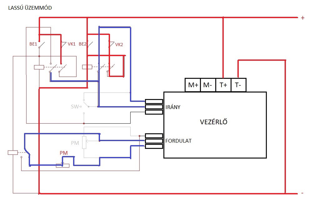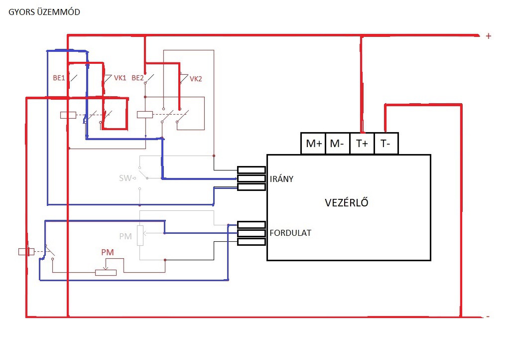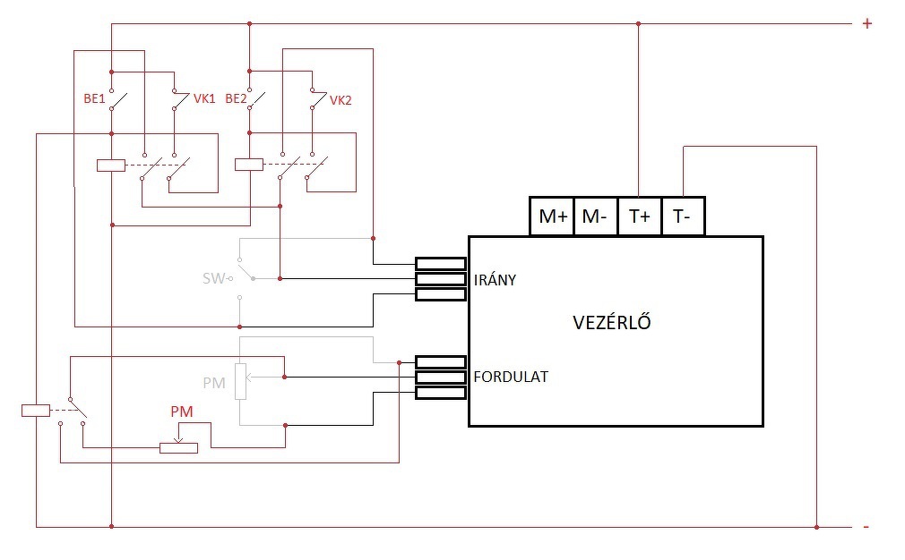 10-50V, 40A, PWM DC Motor Controller, CW, CCW Alapesetben mindkét irányban a potenciométer határozza meg a fordulatszámot, az eredeti feladatnak megfelelően kitaláltam hozzá egy relés kiegészítést. Két darab DPST relé öntartással a két irányhoz, valamint egy SPDT relé, hogy az egyik irányba a potmétert kikerülve teljes fordulaton forogjon a motor.