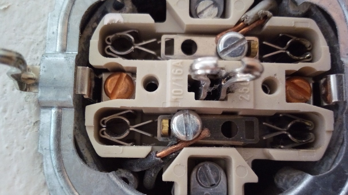 Más téma. A képen látható dupla konnektorban meg akartam nézni, hogy réz vagy alu vezeték van-e. A bekötés módja nem tetszik. Mindhárom vezeték (a föld nem látszik a képen) az egyik csőből kijön, a másikba továbbmegy, le van csupaszolva a szigetelés egy részen, 180°-ban be van hajlítva (majdnem megtörve) a réz. Szabályos ez, illetve ahogyan a csavar fogja a vezetéket? Ha egy kettes Wago sorkapocsba berakom a 180°-ban hajított vezeték részt és a konnektor felé lehozok mégegy vezetéket, az úgy rendben lesz? Vagy használjak hármas sorkapcsot és vágjam el a vezetéket ahol meg van hajlítva?
