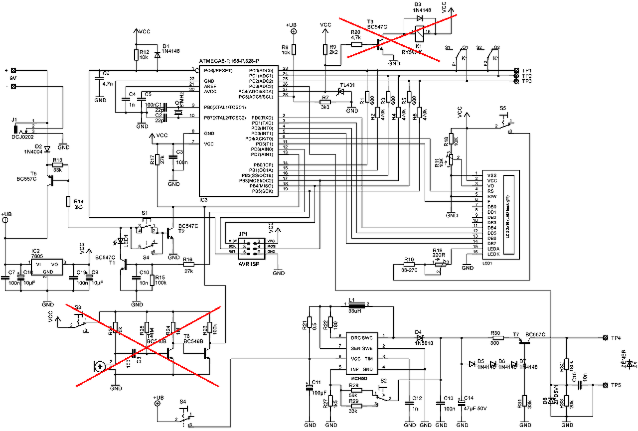 Idézet: „AVR nélkül is meg kellene lennie az 5V-nak mindenhol?” AVR nélkül is. A T5 az automata kikapcsolásért felel.Viszont , ha az ic2 bemenetére fixen rákötöd a 9v ot , akkor igen lenni kell 5v nak mindenhol ahol a rajz jelöli. Nézd át a szerkezeted , mert ez olyan kapcsolás, ami bolond biztosan szokott indulni.Egy két aprólékos beállítás, vagy a kijelző fényerő beállítás szokott gond lenni.De ezen kívül semmi egyéb.Tehát valamit hibáztál , és azért nincs meg az az 5v neked.