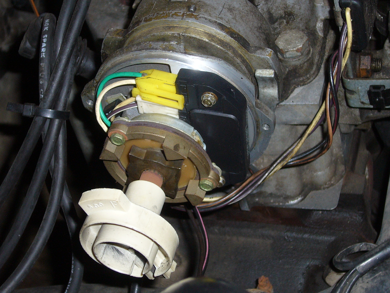 Hát szerintem nem ördöngösség,neked a vezérmütengelyen van az eloszto ,összejelölöd a vezérmü házzal az eloszto házát lekapcsolod rola a kábelt ami oldalt megy rá,azután kiveszed az egész elosztot,nem gond azután ha elfordul mert majd összerakásnál kell ugyanoda forgatni a rotort hogy bemenjen a helyére,a fehér rotort leveszed ,alatta van az a 2 csavar azt kitekered és az alatt lesz a te modulod. a kábel ugy látom abba a fekete dobozba csatlakozik.mondjuk kérdés hogy a fekete modul micsoda....