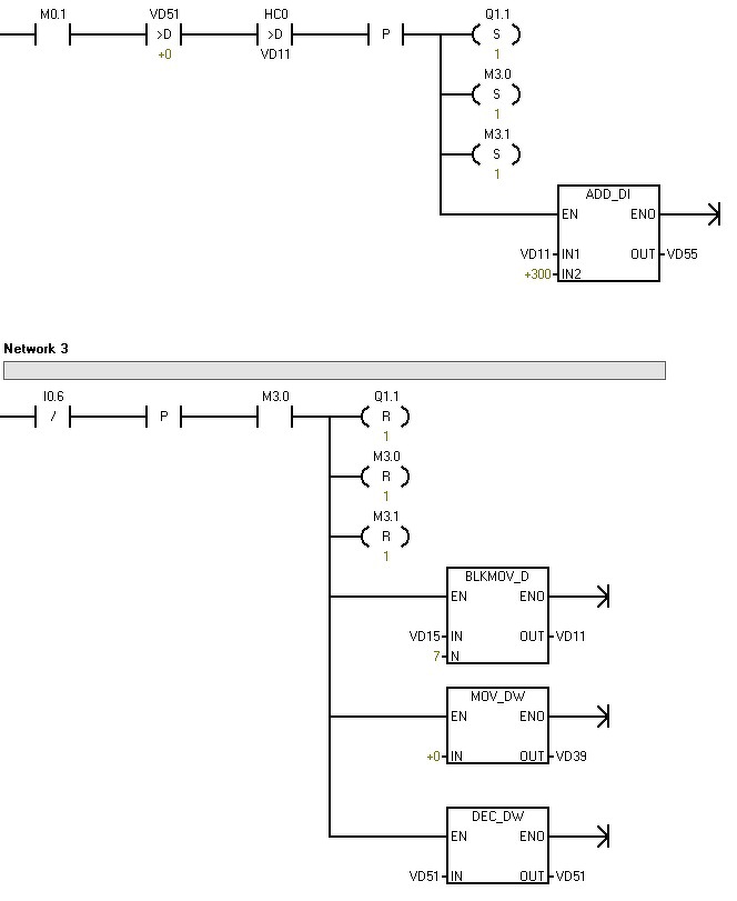 Segítséget szeretnék kérni, bár lehet hogy így nem egyszerű, hogy az egész programot nem látod. De egy részletet kivettem belőle. S7-200 sorozat és ha jól látom Pointer-rel van dolgom. De nem látom át A gép egy üvegeket címkéző gép, a bemenetén 2 adagolószalag van ami válogatja az üvegeket megfelelő távolságra egymástól. Van egy érzékelő ami indítja a Kódolvasást és nyomtatás ellenőrzést, majd kiadagolja a címkét és ráteszi az üvegre. Utána egy szalag és lap között rásimítja a címkét az üvegre, majd megnézi az üvegen rajta van-e a címke, a következő állásban pedig selejtezi az üveget, ha a 3 ellenőrzés közül valamelyik nem jó. Ezt a részletet akkor hajtja végre a PLC, ha rossz a vonalkód, vagy a jelölés. Valahogy az üvegek helyét tárolja el, ahol hiba van ott 1-es van és ezt lépteti egészen a kidobásig és a kidobónál pedig akkor van selejtezés ha 0-ál nagyobb van azon a helyen VD51? Ezt egy bit-enkénti jobbra léptetésnél átlátom, de így hogy pointer van és VB és VD, így nem látom az egészet, hogy mit hova és hogyan tárol. Köszi a segítséget! A hozzászólás módosítva: Szept 5, 2018