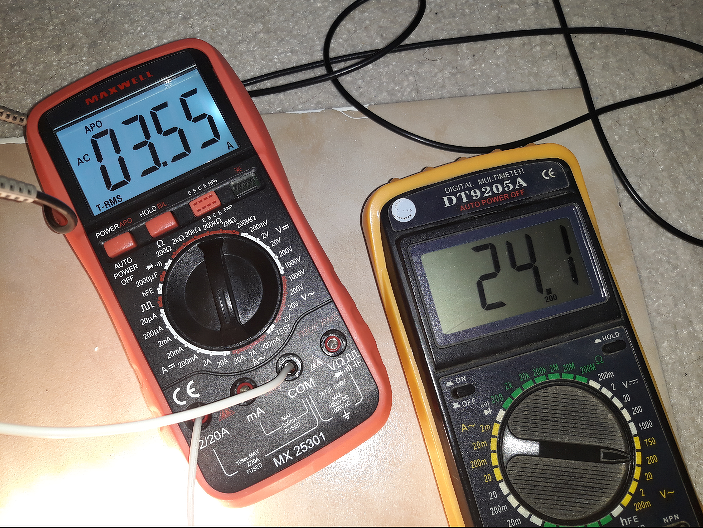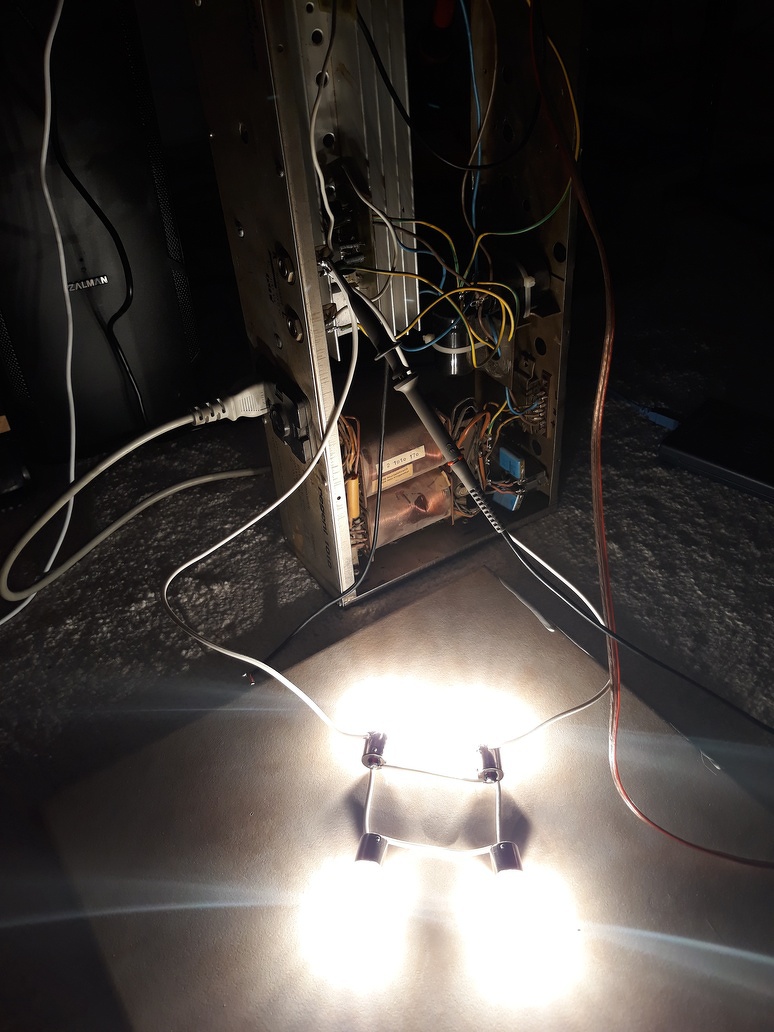 Ha már egyszer fényorgonázunk, akkor fényorgonázzunk... 4db 12V/21W-os gépkocsi izzó soros/párhuzamos kapcsolásban 24V/84W (~6,8Ohm) műterhelést alkotva teljes fehérizzásban a TDA7294 kimenetén. Ezt már talán nem lehet a digitális műszerek P=10*U*I beépített képletére fogni.