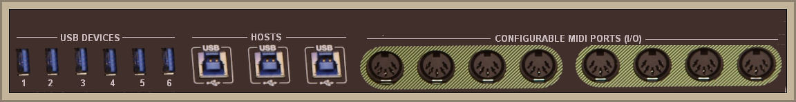 - 6 usb device csak usb-s midi kontrollerek, billentyűzetek fogadására (egyenként tápellátás biztosításával + plug 'n play eszközfelismerés!)