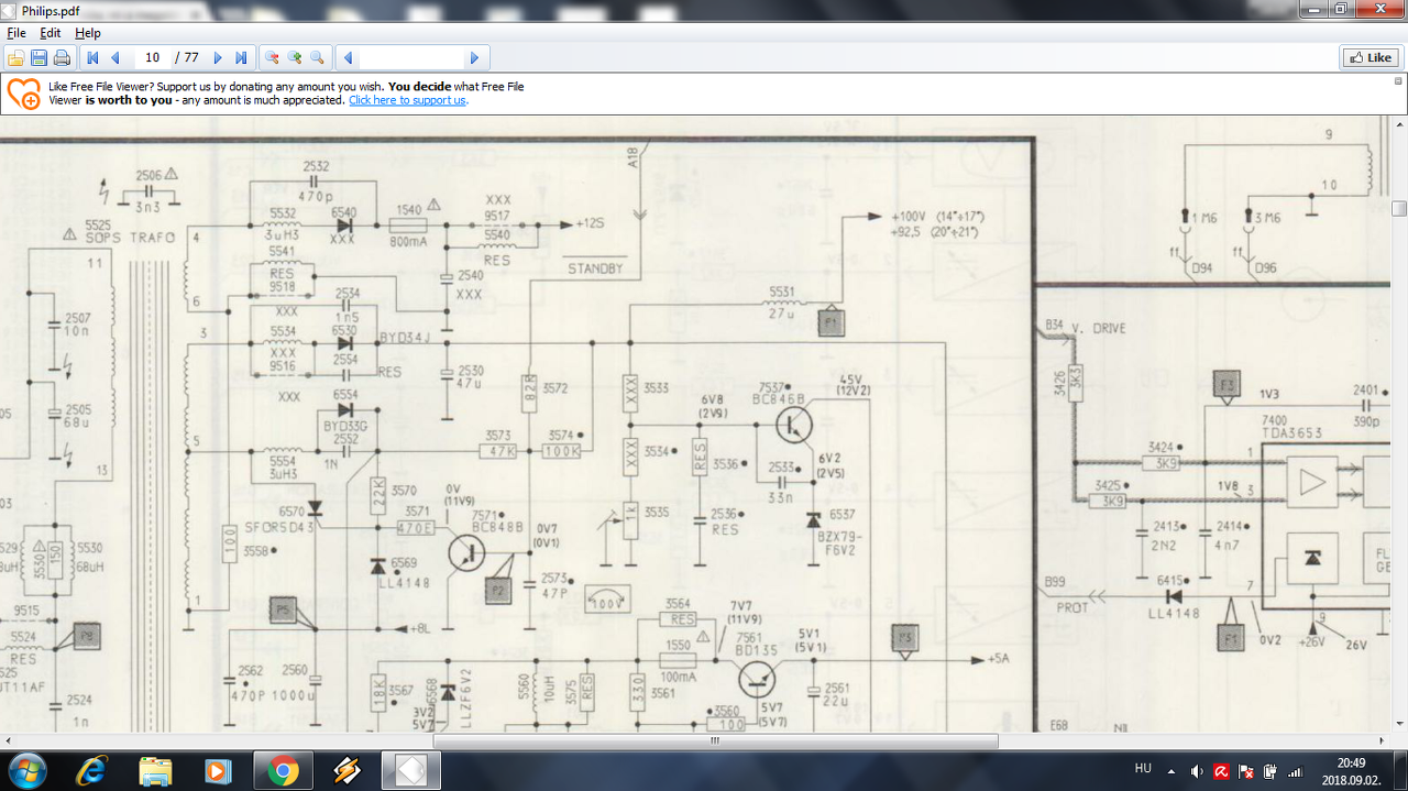 CRT tv probléma. Az alany egy PHILIPS 15PT156B/1 kis tv. Megvan komplett szerviz könyv németül. Az lenne a probléma hogy nem hajlandó bekapcsolni. Nem tudom merre induljak. Primer oldalon megvan a 315volt DC meg szerintem szaggat is a meghajtó tranyó. Ránéztem szkóppal és ott van valami nagy frekis jel. Fütyül a trafó körül talán egyik kerámia kondi vagy a trafó. Nem tudom mi kell mit indítson útbaigazítást kérek. Nem vagyok tv szerelő,erősítőkkel foglalkoztam idáig. Philips 15pt156b/1 Szervíz könyv A hozzászólás módosítva: Szept 2, 2018