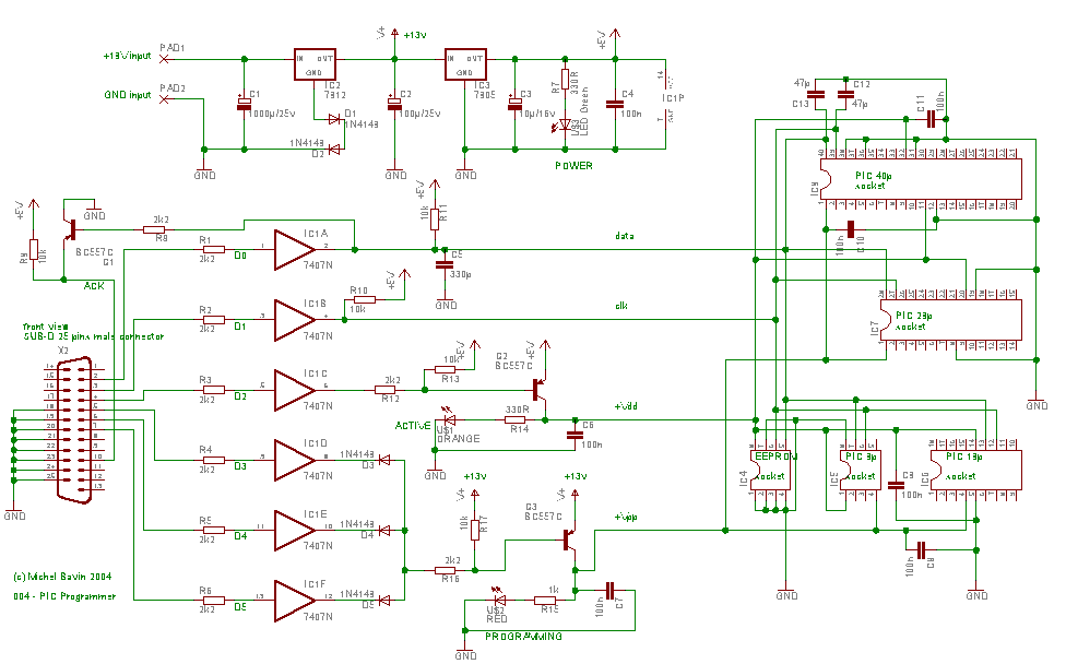 Ha esetleg valakit érdekel és szeretne PC égetőt csinálni nyomtató portra akkor szerintem érdemes ezt a kapcsolást megépíteni. Én most fogok neki az építésnek épp ma jöttek meg az alkatrészek.Annyiban változott a kapcsolás,hogy az eredeti nyák számomra nagynak bizonyult ezért átterveztem kisebbre ill a PIC ek-számára terveztem adapter kártyákat.
