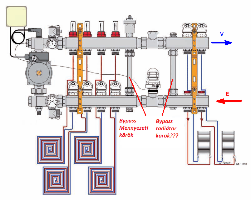 A rendszeren amint a mellékelt képen is látható két osztó gyüjtő van egy a felső és egy az alsó szintnek. Ezek a radiátoros körök amiket egyébként majd szeretnék külön helyiség termosztáttal is vezérelni. A vezérlést majd egy Computherm Q8 RF rendszerrel valósítom meg! Találtam itt régebbről egy képet padlófűtés és radiátoros rendszer bekötésére! Ezt gondoltam kivitelezni. Az osztó gyüjtőket természetesen cseréleném és fel raknék még egy osztó gyüjtöt a felső szintire rákötve külön a mennyezet fútésnek keverőszivattyúval és termosztatikus szeleppel az alacsony hőmérséklet beállítása érdekében. Eddig remélem jó az elgondolásom. Na most. Vettem is ilyen osztót amin található by pass kör is és az egyik kérdésem az lenne hogy a radiátoros körnek is kellene bypass kört beépíten mint ahogy a képen látható? A kazánom egy Baxi Nuvola 240fi kondenzációs gázkazán és ebben van egy automatikus beépített bypass szelep, ha jól tudom! Ha van akkor nem felesleges a radiátoros körre rárakni még egy bypass-t? Kell egyáltalán bypass cső a mennyezeti fűtés körre?