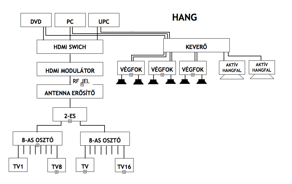A következőkben leírt probléma megoldásában kérem a segítségeteket. Kialakításra került az alábbi ábrán látható rendszer amelyben ugyan tökéletes a kép és a hang is , de sajnos a kép csúszik kb. 4 mp –et. Egy sport közvetítésnél vagy karaokén rendkívül zavaró ez a jelenség. TV képnél ugyan megoldottuk a problémát azzal, h egy TV fülhallgató kimenetéből vesszük ki a hang jelet, de ez egyéb alkalmazásnál nem megoldás. Szükségem lenne egy olyan eszközre, amely a hangot 4-5 mp –el késlelteti. Az általam talált (megfizethető) eszközök max. 1mp-et tudnak késleltetni, de azoknak sem ez a fő funkciója (gerjedés gátlók, rendszer procik).