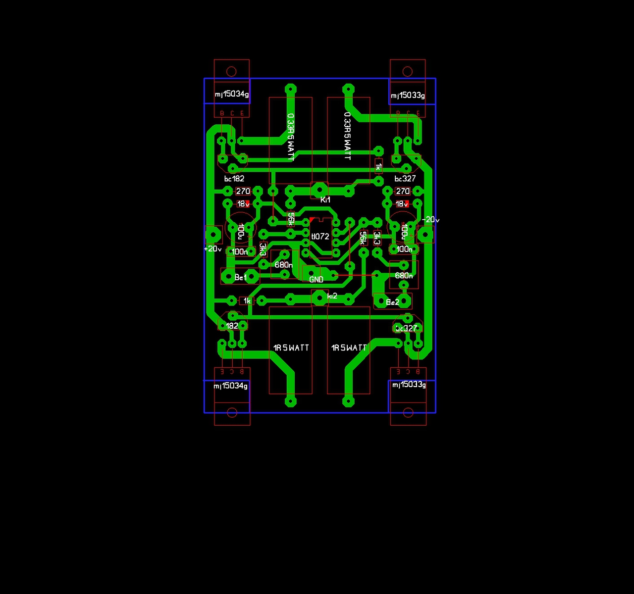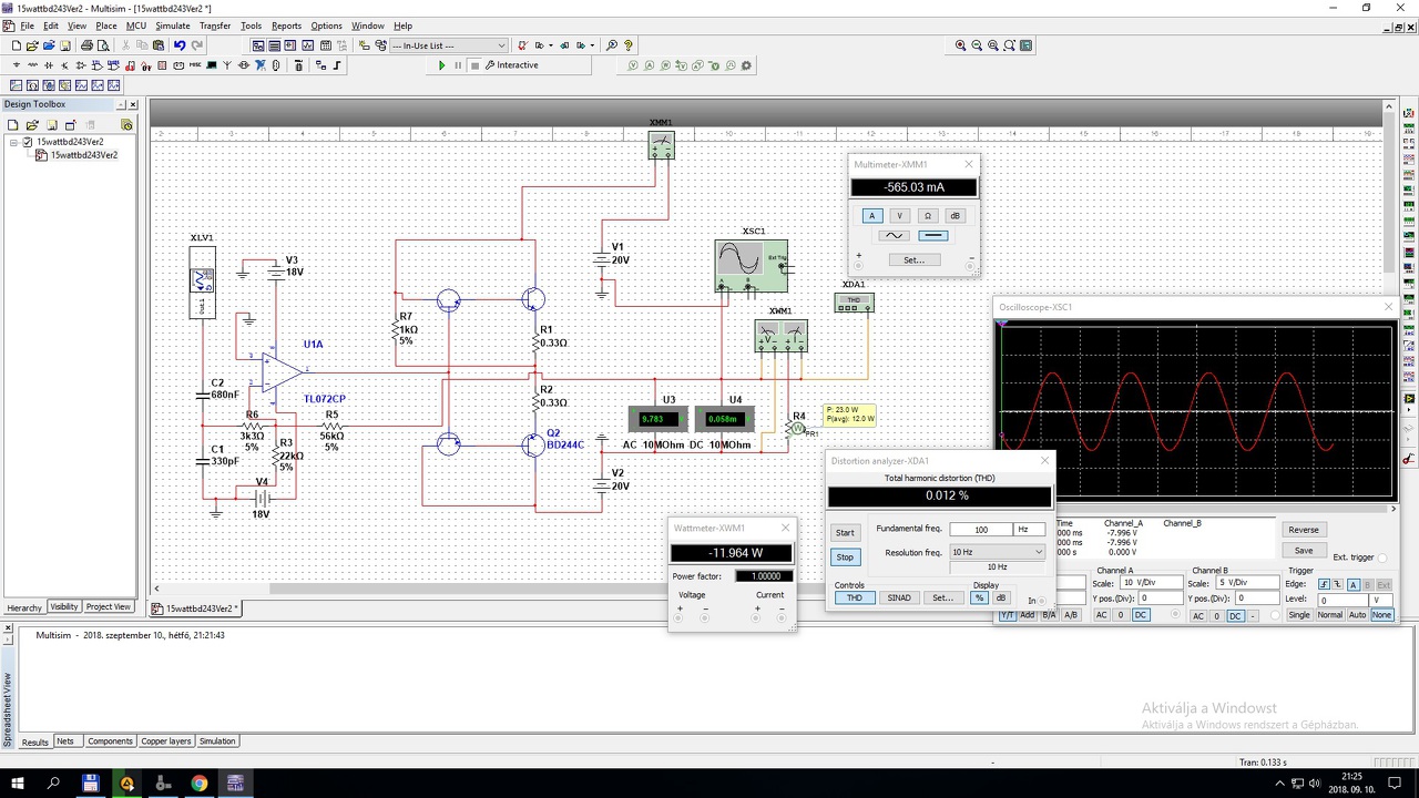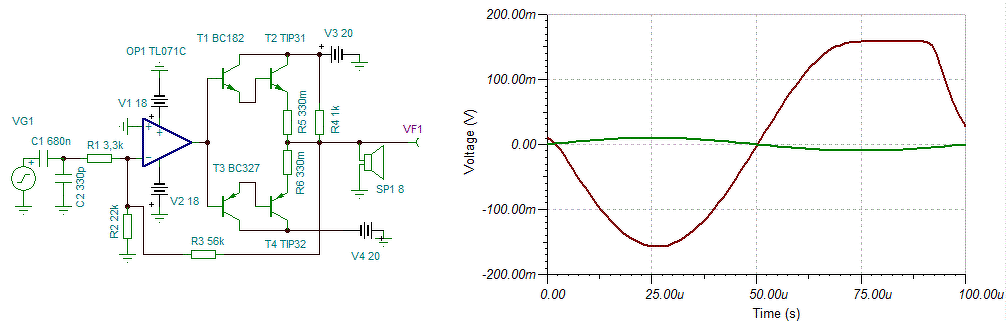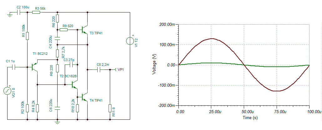 Szia! Megépítettem amit terveztem végfokot , nem dicsérni akarom , de sem gerjedés , sem más egyéb hallható probléma nincs , ráadásul a hangja is nagyon tiszta ! Nem tudom , hogy a multisimben mért kimenő teljesítménynek mennyire lehet hinni mert mintha több lenne 14 wattnál , 2 nagy topládát kötöttem rá 8ohmosak 150watt/db , és dübörög rendesen