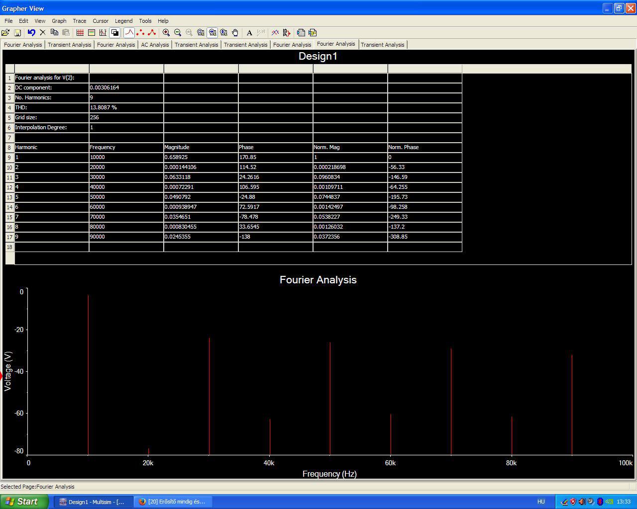 13.8% a THD 1.3Vpp-nél 10 kHz-en. Az AC analízist nem tudja megcsinálni a "B" osztály miatt (pontosabban hülyeséget mutat).