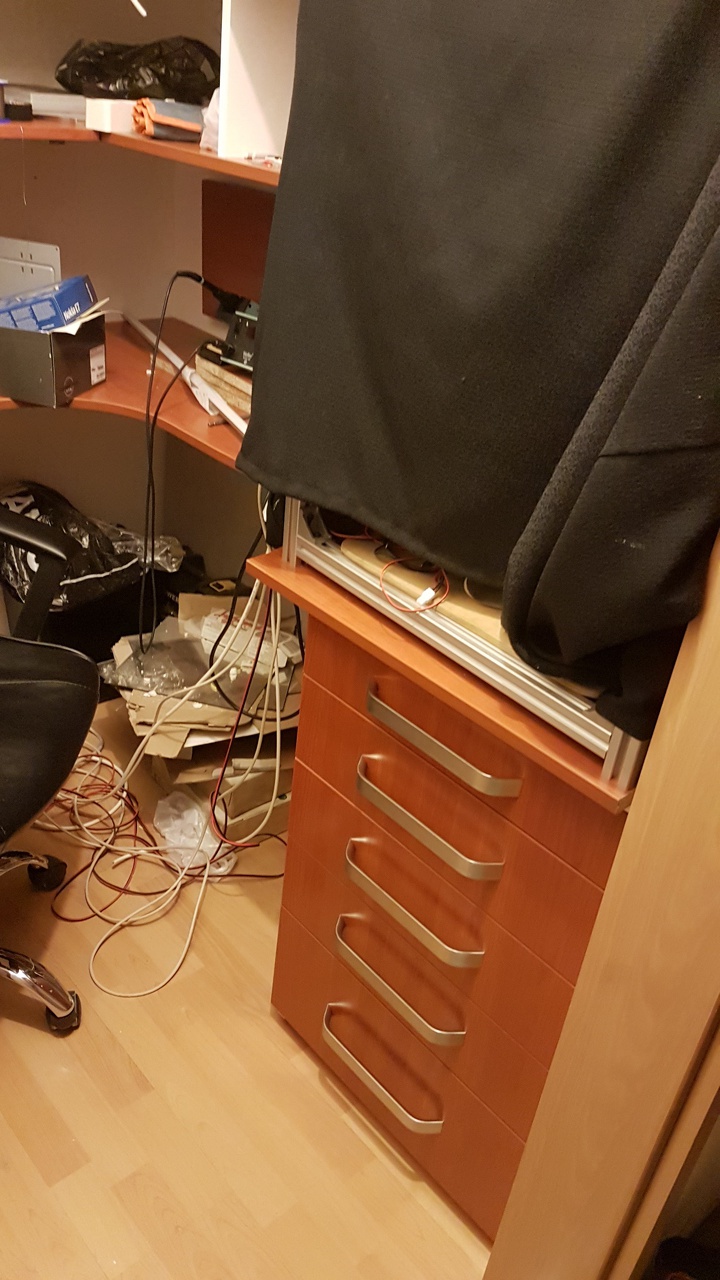 Megterveztem a szekrényeket a kis helyiségbe és az asztallapot le is vágattam, az már a helyén van. Meg a készülő 3D nyomtatóm. Három szekrényt kell még építenem, egyet a 3D nyomtató alá amelynek 5db fiókja lesz. A másik kettő a falra lesz feltéve, az alsón két kisebb és két nagyobb fiók lesz egymás felett, a felső szekrényen pedig 5db ajtó, mögötte pedig polcok. A szkópnak, a forrasztóállomásnak és a hőlégfúvónak pedig még lesz az alsó szekrény alatt egy nem túl mély polc (ez még nincs rajta a terven).