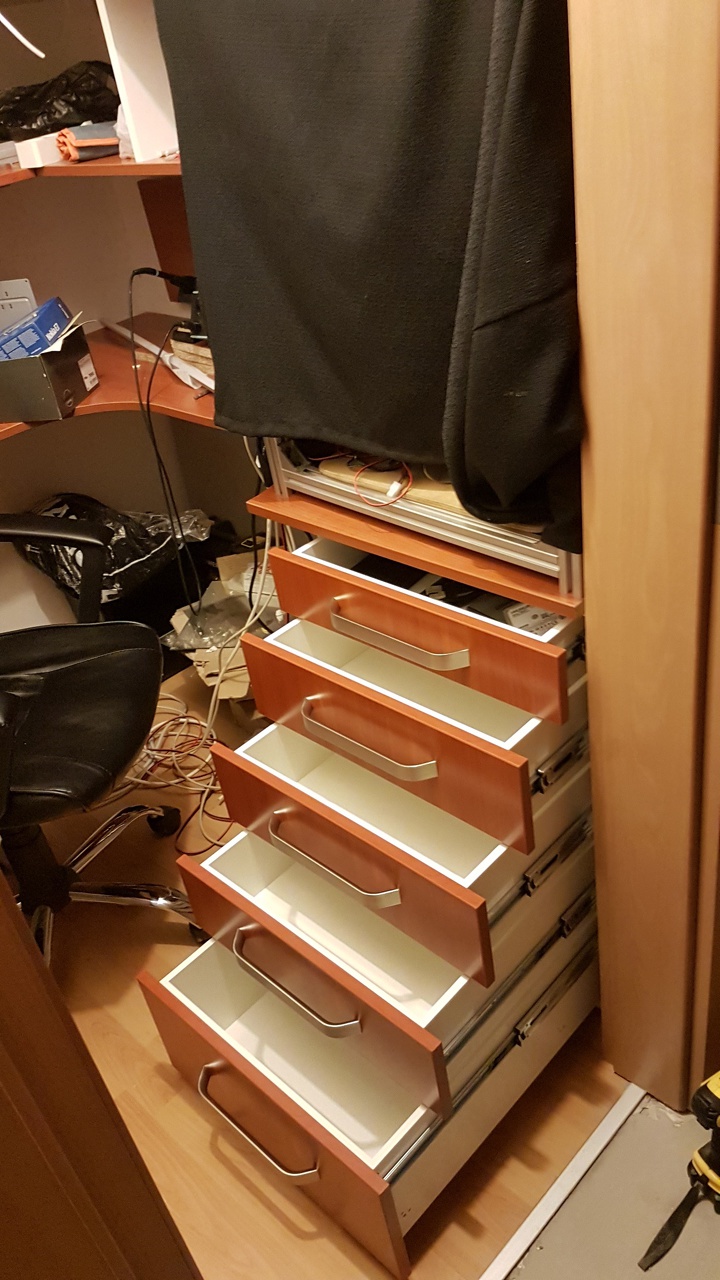 Elkészült a 3D nyomtató alatti szekrény. Teljes kihúzású tompítós fióksíneket (500mm) használtam és a fiókelők szabási terv szerint lettek vágva hogy a mintázat (kaliforniai cseresznye) szépen fusson a fiókelőkön. Hogy minél nagyobb helyem legyen (a helyiség és az egész lakás nagyon pici) ezért a fiókok 10mm-es bútorlapból vannak 18mm-es helyett.