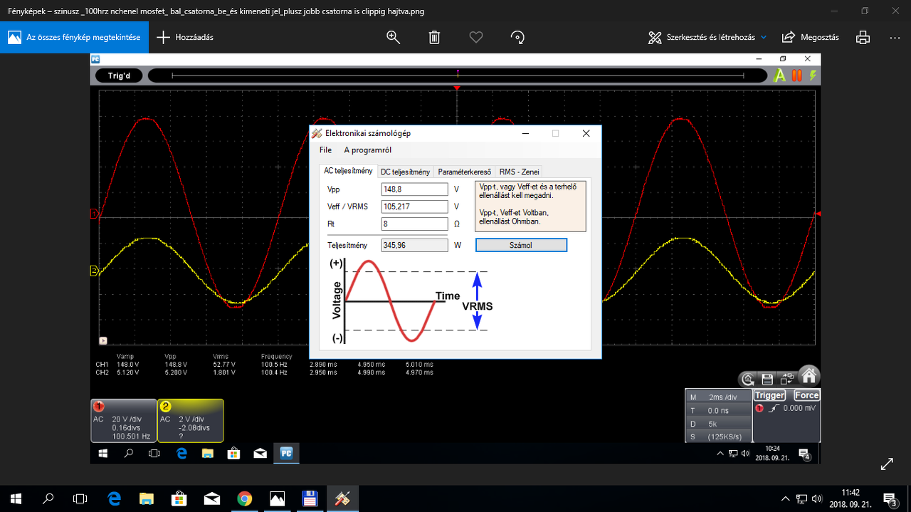 Ha 156 V a kimeneti feszültség csúcsértéke, akkor ez 55,15 V effektív értéket jelent, ami 8 ohmos terhelésen 380 W teljesítmény. Ez komoly érték, de nem tudjuk a mérés közben mindkét csatorna terhelve volt-e egyszerre vagy csak az egyik. A tápegység szempontjából ez lényeges különbség, ha közös a táp. Ha egyéb korlátja nincs a dolognak, akkor érdemes lenne a mérést 4 ohmon is megismételni (mindkét csatorna egyidejű terhelése mellett). A kér érték viszonyából több hasznos következtetés is levonható. Illetve itt jól tesztelhető a hűtés hatékonysága is.