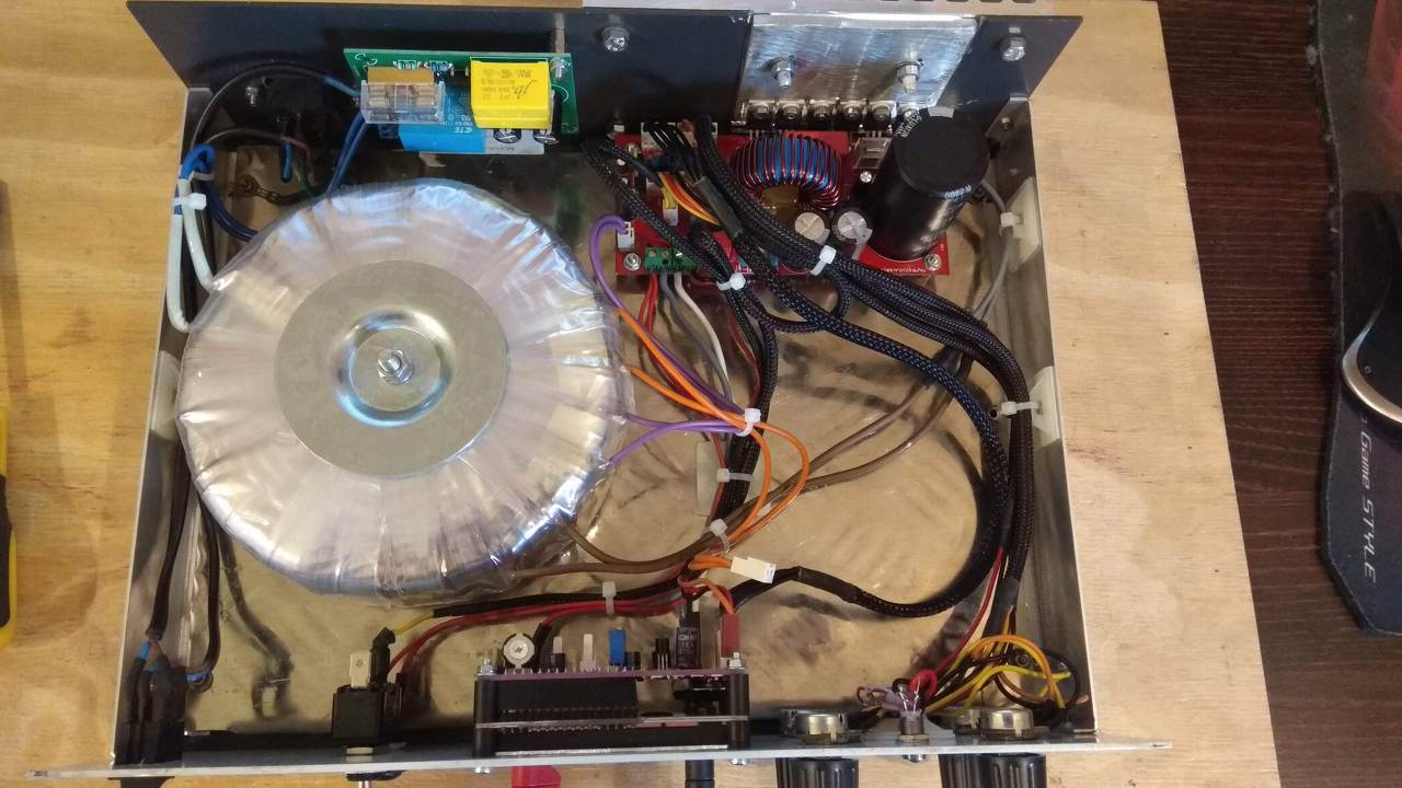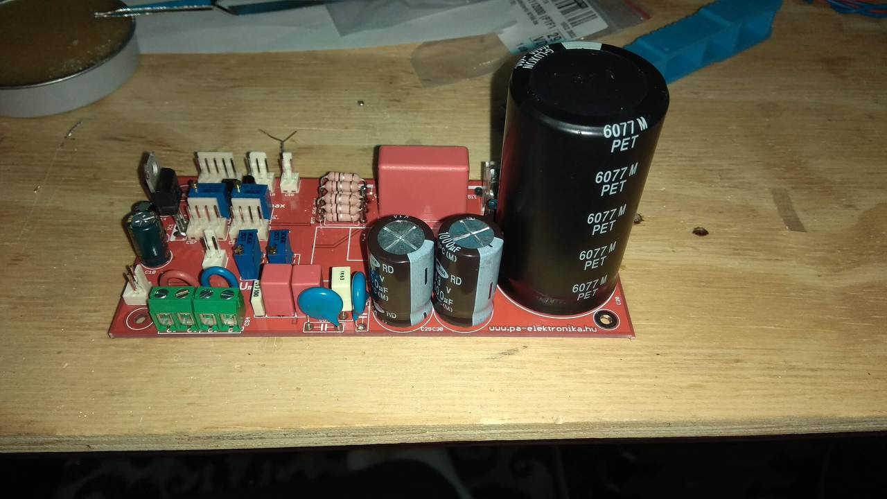 A dobozolás elején szembesültem vele, hogy a trafó súlya miatt a műszerdoboz alja nem egészen fut vonalban az előlap aljával így került bele egy 2,5mm-es alu bordás lemez szélein minimális élhajtással(mert több nem fért volna el lefelé) a merevítés miatt. Az ajánlott 150x200x150-es műszerdoboz kicsinek bizonyult a trafó mérete miatt, ezért esett erre a döntésem. Az LCD kijelző és a panel tüskesor+aljzattal összerakva a könnyebb cserélhetőség végett, ez az utánépítés cikkében nincs benne. A potméterek vezetékei mivel egy helyre mennek kábelharisnyával+zsugorcsővel közösítve, külön a feszültség külön az áram szabályzásnak. A trafót itthon tekertettem egy cégnél, érdeklődés esetén szívesen megosztom. Végezetül pedig a képek: Képek az elkészült tápegységről Feliratok azóta lettek hozzá kreálva címkenyomó masinával, viszont arról nem készült már kép.
