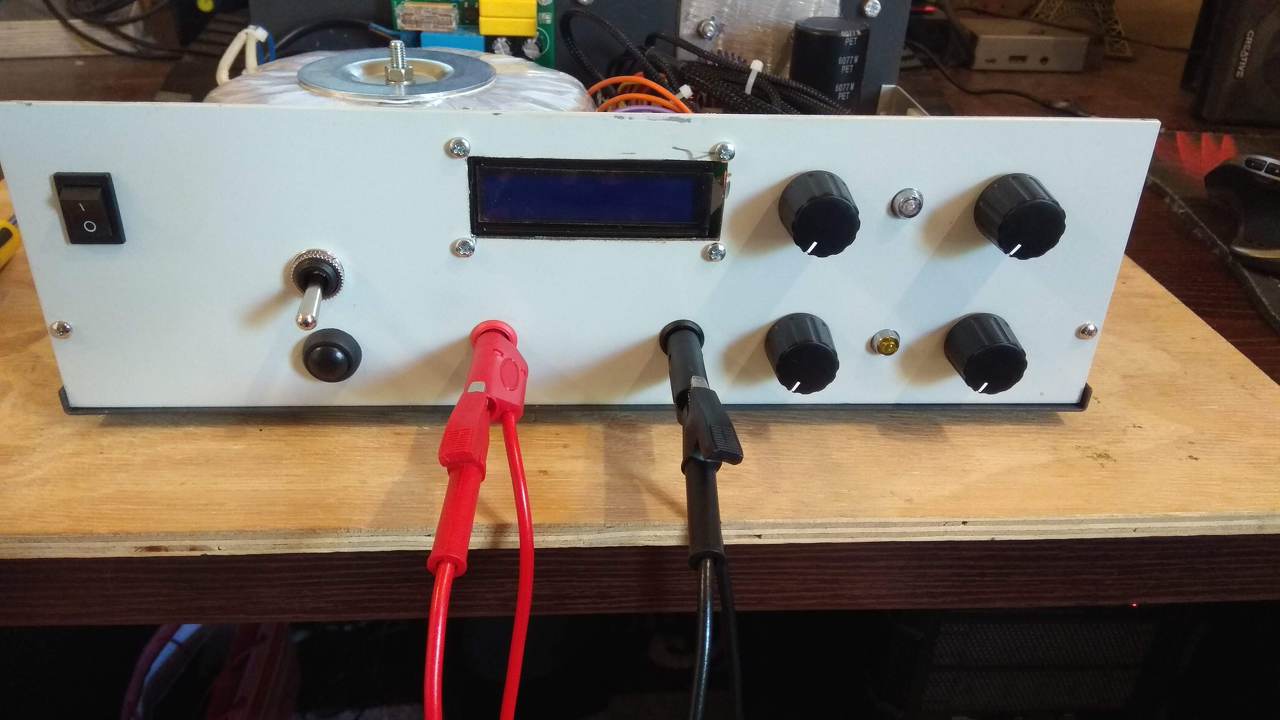 A dobozolás elején szembesültem vele, hogy a trafó súlya miatt a műszerdoboz alja nem egészen fut vonalban az előlap aljával így került bele egy 2,5mm-es alu bordás lemez szélein minimális élhajtással(mert több nem fért volna el lefelé) a merevítés miatt. Az ajánlott 150x200x150-es műszerdoboz kicsinek bizonyult a trafó mérete miatt, ezért esett erre a döntésem. Az LCD kijelző és a panel tüskesor+aljzattal összerakva a könnyebb cserélhetőség végett, ez az utánépítés cikkében nincs benne. A potméterek vezetékei mivel egy helyre mennek kábelharisnyával+zsugorcsővel közösítve, külön a feszültség külön az áram szabályzásnak. A trafót itthon tekertettem egy cégnél, érdeklődés esetén szívesen megosztom. Végezetül pedig a képek: Képek az elkészült tápegységről Feliratok azóta lettek hozzá kreálva címkenyomó masinával, viszont arról nem készült már kép.