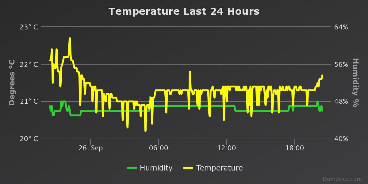 Mellékelt hőmérsékletlefutás eléggé cakkos. Az ESP sima telefontöltőről kap 5V tápot, és egy padlástérben van, ahol nem szokott a hőmérséklet így ugrálni. Elsőre már kicseréltem a töltőt egy drágábbra, de nem javul a cakkozás.