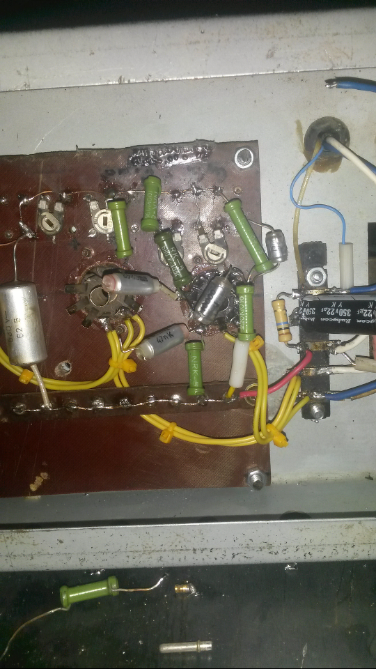 Pont most írtam madzagosnak hogy az első próba kapcsolásnál csak anód ellenállást és negatívra húzott katódot használtam műszeres méréssel egybekötve. Ott kezdtem el kitapasztalni a miértet. A cső még él. Ez volt a működő képes verzió. Az összeköttetést csak az alkatrész lábak biztosítják.