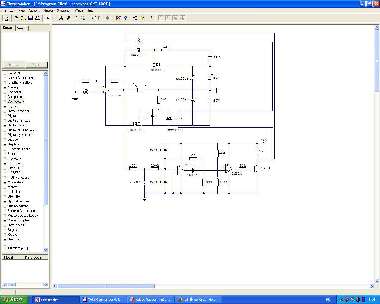 Itt egy crowbar védelem kiindulásnak, szerintem erre gondolt Béla is. Hasonlót már több végfokomban használtam és elégszer le is teszteltem. Hiba esetén mukk nélkül elhallgat a hangszóró, mintha csak a bemenet lenne némítva. A tirisztort és a vele soros ellenállást nagyon jól kell méretezni, különben a védelem aktiválódása valamelyik (vagy mindkét alkatrész) halálát eredményezi.