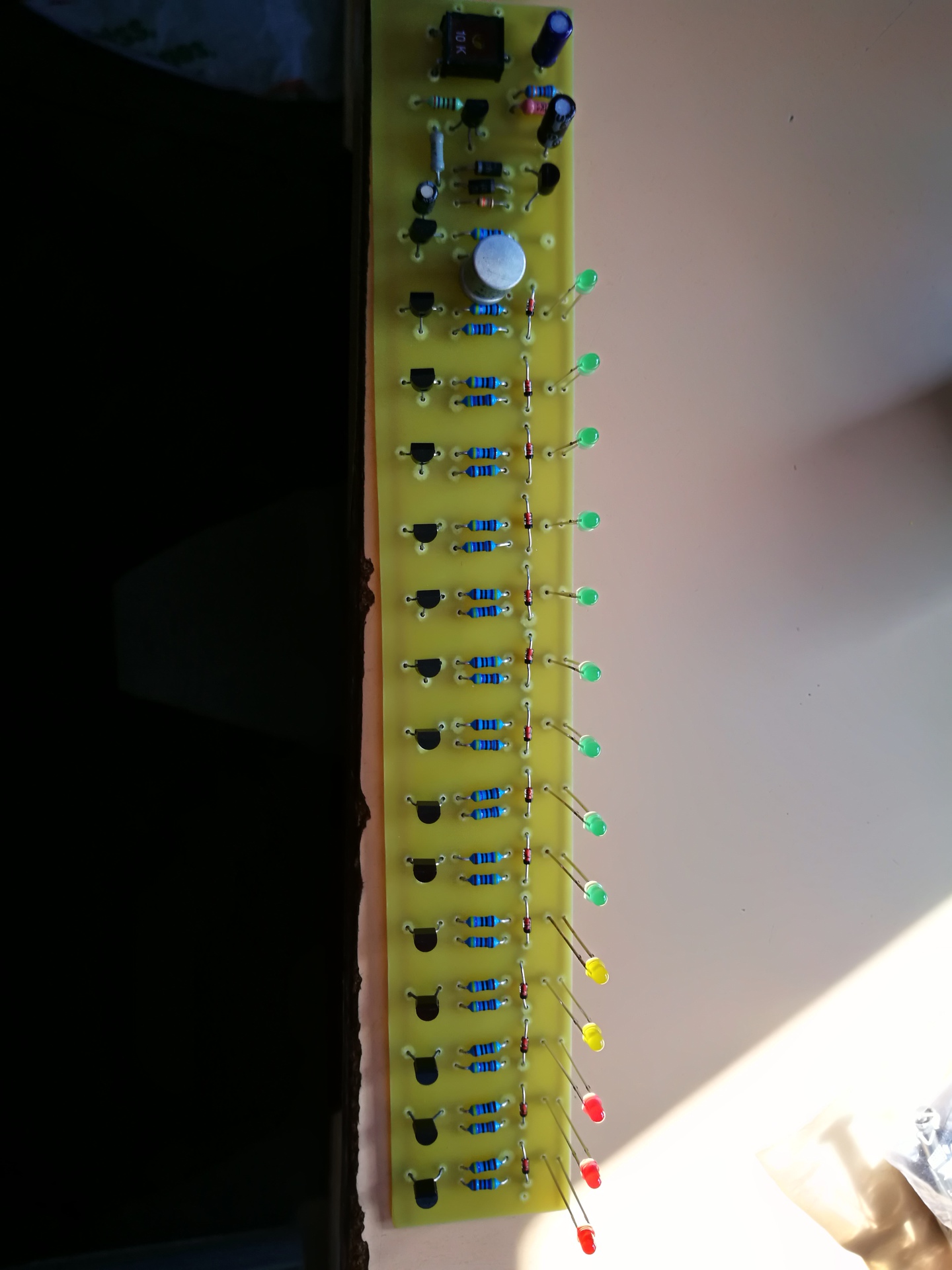 Tehát így működik "zöld-zöld és piros- piros". Tekintve, hogy a zöld és piros együtt is világít, két meghajtó LM3915-öt kell használni egy időben. Egyet a zöldeknek, egyet a pirosaknak. A színenként közösített anódokat kell kapcsolni PNP tranyóval.