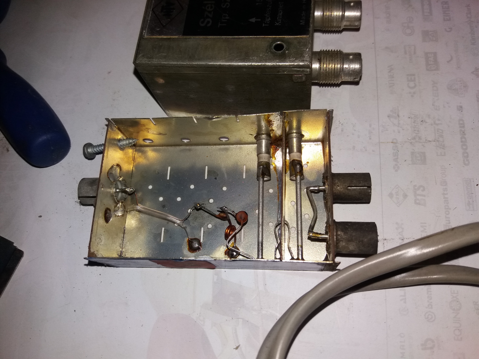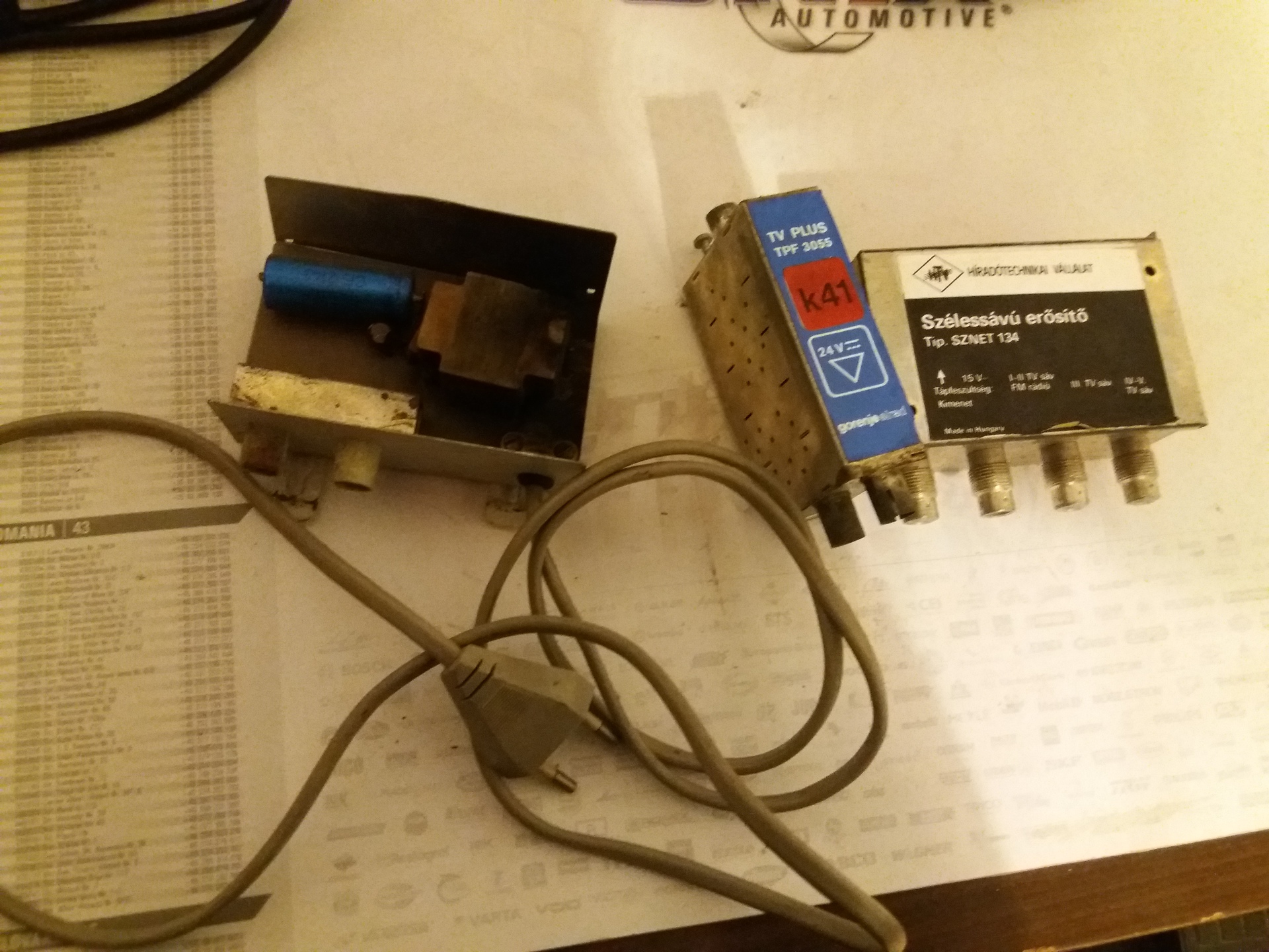 Sajnos csak részben értem a dolgot. Az a 2x 75cmes antenna meg volna szerintem több izben is, viszont balun trafót pont nem találtam a cuccok között.. Mellékelek 3 képet, ezeket találtam sok sok Y osztó társaságában. Az érdekes, hogy az erősitő kimeneti ága valamiért a szétrobbant trafóra volt kötve, onnan meg ment egy Y osztóra, és tovább. A kék 24vos valamit nem tudom kitalálni, a belseje.