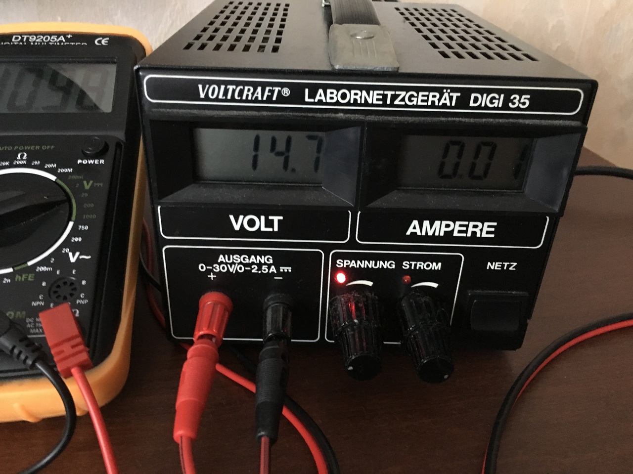 A képen kicsit kusza a vezetékezés. Most a +s akkupakk van bekötve, így a képeket is erről készítettem. Első képen az akku üresjárati feszültsége látható. Második képen a labortáp kimeneti feszültsége. Ez utóbbi terhelés és üresjáratban is stabil.