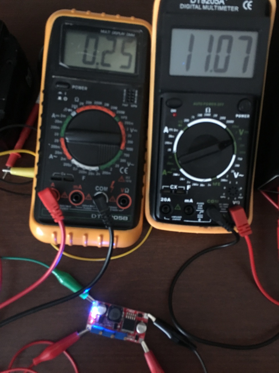 4. kép: Ha elkezdem csökkenteni a kimeneti áramot, akkor olyan 0,25A környéké elkezd világítani mind a kettő led.