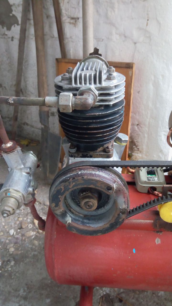 Valószínű hogy vizhűtéses volt eredetileg csak a hűtőköppenyt leszedték róla. Eléggé fel tud melegedni. Nekem ilyenböl van csinálva a kompresszorom csak bordás hengerűvel. 1,8Kw-os villanymotorral hajtva.