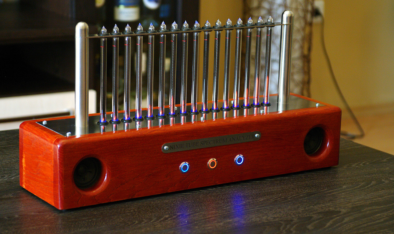 Jobb oldalon a sok éve készült nixie órám, illetve a hétvégén elkészült nixie audio spektrum-analizátor a következő funkciókkal: