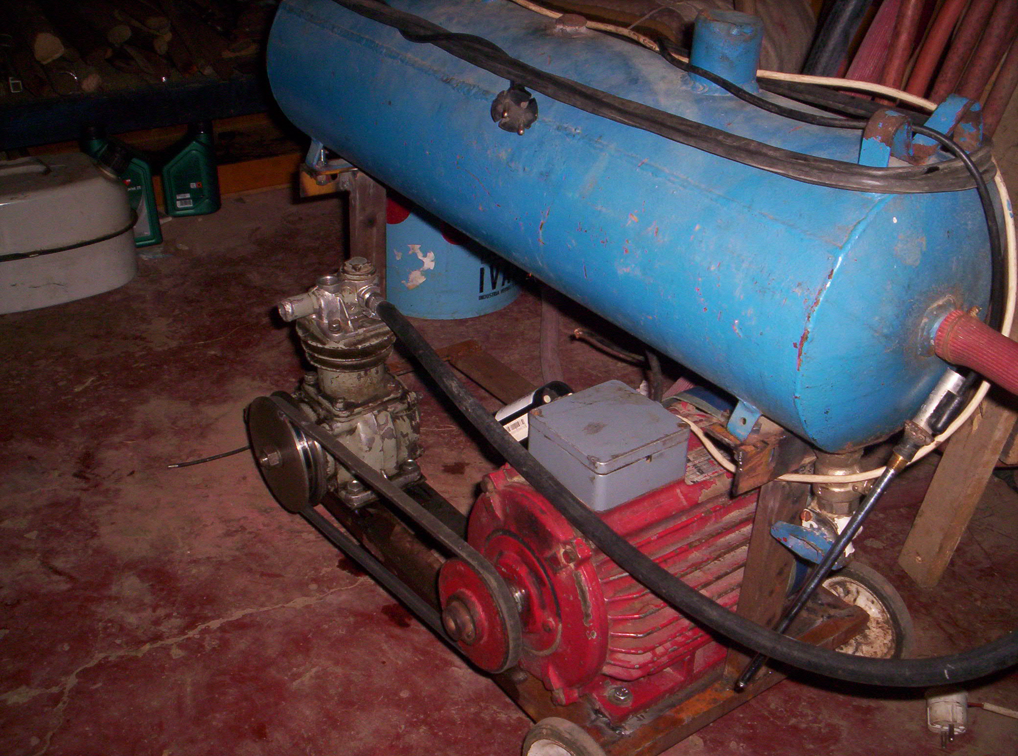 Nah átkötöttem deltába és raktam rá egy nyomógombbal 160mikrós indítókondit Igaz hogyha nyomás van a tartályba nem indul de simán jó....És nekem ugyis csak akkor van benne amikor kell,szval jóezígy7bar-t ígyis lazán fölnyomja Raktam föl képet az én saját művemről Sokan nemhisziek el h egy gyerek ilyet tud csinálni!(am 15éves vok) Még nincs kész teljesen sőtt...Még rendesen vascső kell a tartályhoz meg stb..ilyen kisebb munkák.de már használható...(az olajfolt az nem belőle van alatta,ráöntöttem véletlen) Kiváncsi vagyok sztetek milyen....Az antenna ami véletlen rajtvan képen nem a kompresszorhoz tartozik