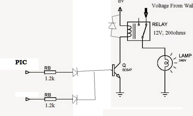 Tehát van két kimeneted, amik egy relét kapcsolnak. Először is kellene, egy igazságtáblázat. Mi van, ha csak az egyik kimenet magas? Akkor is kapcsoljon a relé? Tehát a két kimenet között vagy kapcsolat van? Ez esetben minden kimenetre egy soros dióda, ezek katódja megy a tranzisztor bázis ellenállására.