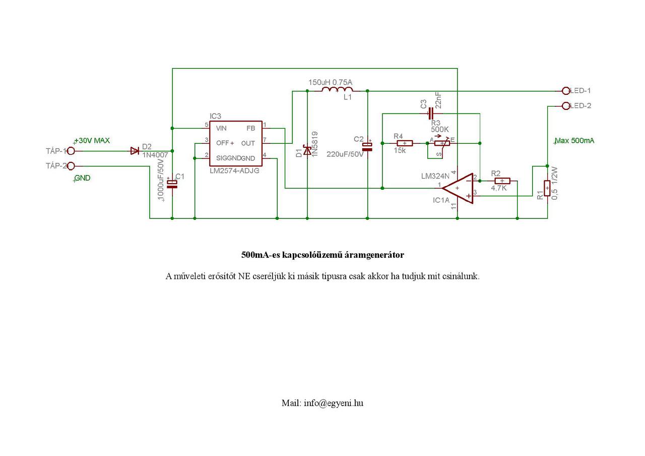 Az volna a kérdésem, hogy ha áramgenerátorról hajtok meg egy led-et, akkor mekkora feszültség fog kialakulni az áramgenerátor kimenetén? Jól gondolom, hogy a Led nyitófeszültsége lesz ez az érték? A mellékelt képen látható kapcsolóüzemű áramgenerátort szeretném elkészíteni, csak a erősebbik testvérét felhasználva (lm2576), és ehhez kellene tudnom a kimeneti feszültséget is, hogy az L1 induktivitás értékét az IC adatlapjában megtalálható képlet alapján ki tudjam számolni, illetve meg tudjam választani. A kapcsolás leírása itt olvasható: Bővebben: Link A söntön eső feszültséget gondolom még hozzá kell számolni a Led feszültségéhez. De ezt a feszültséget átfolyó áram alapján meg tudom határozni.