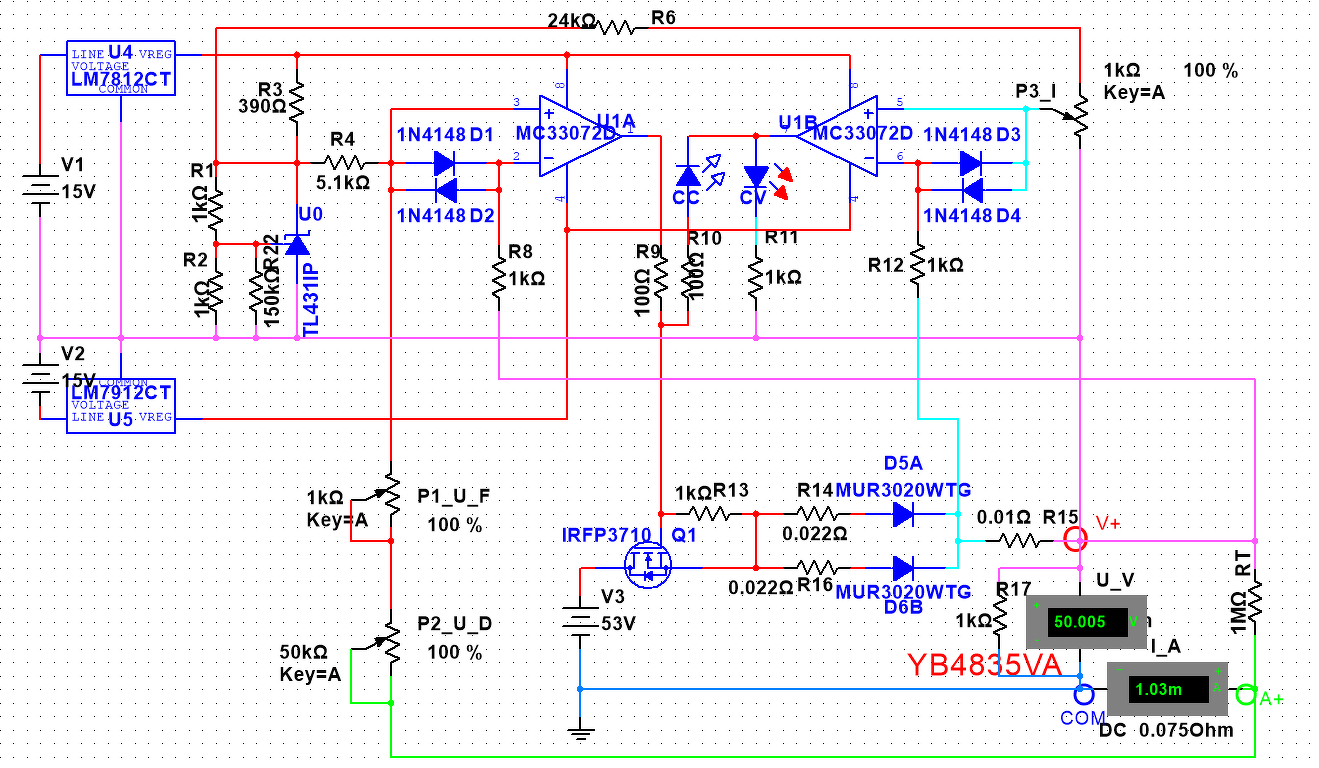 Köszönöm, hogy ilyen gyorsan, tanulságosan, és érthetően válaszoltatok. Hogy az elején kezdjem: kora nyáron a TR-9158-amat kinyírtam egy irdatlan DC-motorral. (Főleg) Proli007 segítségével sikerült helyreállítani, de nem az igazi a finomszabályzója. Hogy őszinte legyek, meguntam, hogy mászik, oda áll, ahová kedve tartja, hol többet, hol kevesebbet "mér" 1-2 V-al. A finomszabályzó kiváltására született a fentebbi megoldás. Ráadásul van egy békebeli, 48 V, 1600 VA-es "Kaposvári" trafóm. A diódák akkumulátor "ellen" vannak, elhagyhatóak, típusuk azért ilyen, mert ilyet leltem a Multisimben. Együttfutásuk érdekében beépített 0,022 Ohmos ellenállásaik valóban rossz helyen vannak, az áthelyezendő, és a közös katód után be kell iktatni egy pl 0,010 Ohmos ellenállást a CC üzemmód áramérzékelőjének (1. képecske). A "lássuk uram Jézus, mire megyünk együtt" elv alapján kipróbáltam a 2. képecske szerinti verziót, melyet átvészelt épségben a műszer, de természetesen 0,00 A-t mutatott, míg a feszültséget korrektül mérte. Kidobozoltam, van benne sönt, kiterítve kb 42 mm hosszú lenne, D2,34 mm, látszólag kanthal huzalból. De nem az, mert 1 A átfolyó áram esetén 3,0 mV, míg 2 A esetében 6,4 mV feszültségesést mértem rajta (ez Ró = 1,39 Ohm mm2 /m kanthal esetében kb ötszöröse lenne). Innentől kezdve okafogyottá vált a probléma, mert ha valaki olyan tápot(na) tud csinálni, aminek a voltmérője 20 A terhelésre 0,064 V-al (vagy 0,075-el) többet mutat, az már nem semmi...(50 V-nál ez csupán 0,1% körül van) Bár ilyen lenne... Ge Lee! A 2k2 az IC-n belül, a kimenő komplementer PNP tranzisztorának emitter ellenállása? Sajnálatosan eszembe sem jutott, hogy 1 MOhm terhelésre túlszalad a kimenőfeszültség, pedig sem egy nyomorult induktivitás, sem egy komolyan vehető kondenzátor nincs benne. Honnan veszi a 120-70=50 V feszültséget? Mindenesetre a 3. ábrácska R17 1 kOhm előterhelése segített a bajon. Így alakult ki a _4... Kár, hogy újabb 2,5 W fűti majd a tápot... Már csak a FOK-GYEM 4-5 V-os tirisztoros előszabályzóját kellene kiváltani Attila-félére, mart az IRF(P)3710 (-ek???) nagyon melegedne. Köszönöm mindenkinek a segítséget! A hozzászólás módosítva: Nov 12, 2018