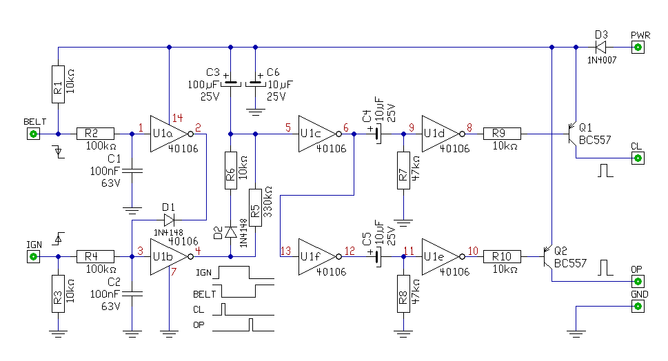 IGN=Gyújtás feszültsége PWR= Fix +12V OP = Nyitás CL = Zárás GND= Test A reakció időt (gyújtás ráadása/elvétele utáni késleltetési idő) az R2-vel (így kb. 1sec), a nyitó és záró impulzus hosszát R3 és R4-el változtatható (most kb. 1sec).