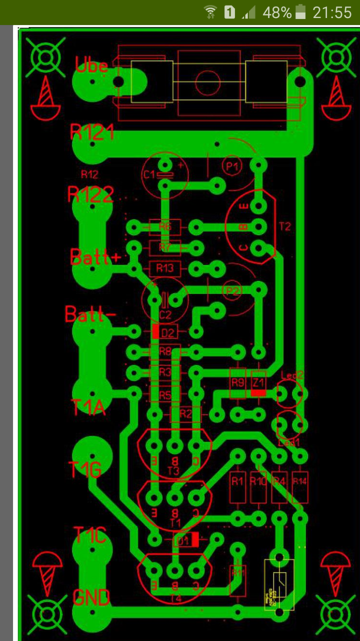 Találtam egy másik rajzot is erről. Az elsőn nem látszik rendesen de a Zener, 9,1 V -os. A Q1,4 tranzisztoros felerősítik az 50 Hz-es ripple-t , s ez nyitogatja a tirisztort, 50 Hz -el. A másik kettő, csak ezt csökkenti, illetve lezárja a beállított értéknél. Ha a bejövő tápod más értékű, a potik előtti ellenállásokat lehet változtatni kell. Az E-B feszültségeket kellene nézni, hogy neg van e 0,6-07V a biztos nyitáshoz. Mint írtam a panelrajz nem biztos, hogy jó, úgy találtam, lehet van még benne hiba. Én is meg akarom építeni, csak még nem jutottam odáig. Ami Német töltőhöz akartam, abban leégett az eredeti trafó, nemrég találtam bele egy másikat, aminek az elektronikája égett szét. .