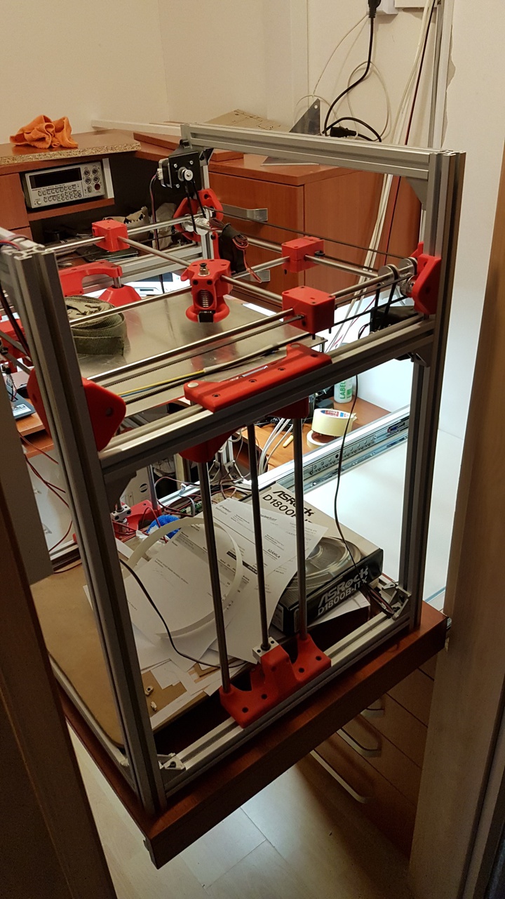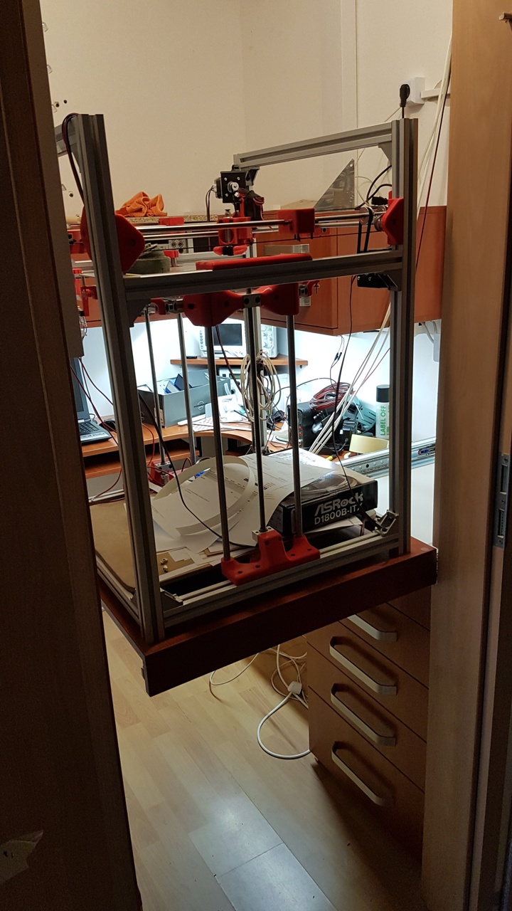 A 3D nyomtatóm saját tervezésű és még tervezés/építés alatt van, ezért sokszor kell rajta szerelgetni valamit. Mivel a sarokba raktam így elég nehéz hozzáférni a hátuljához de még az oldalaihoz is. Főleg baj ez azért, mert az X és Y motorok illetve az extruder(ek) és a filament is hátul van. Ezért kitaláltam egy szerkezetet amivel ha szükséges, akkor ki lehet húzni a gépet úgy ahogy van: