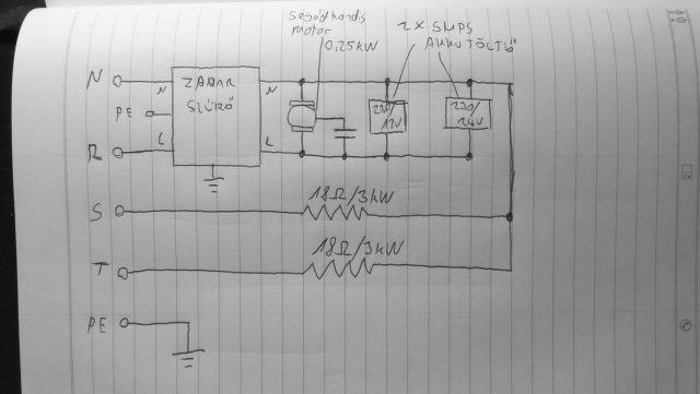 Kérdésem a következő: Mekkora áram folyhat a nullavezetékben? A két akkutöltő kapcsolóüzemű,darabonként olyan 60 Watt lehet,a motor segédfázisos 250Wattos,a két fűtőbetét Ohmos terhelés,2x3kW.