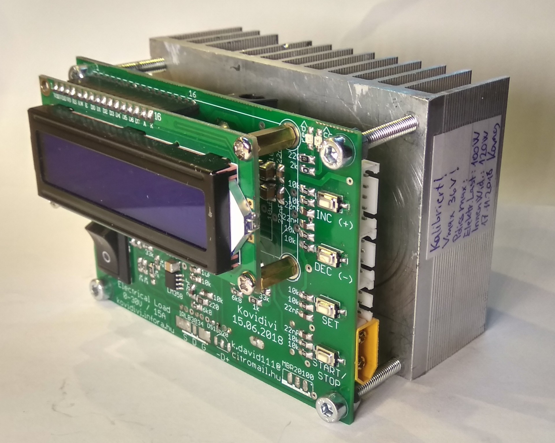 Úgy gondolom, hogy készen van az elektronikus műterhelésem, kikerülhet a témába. 36V a bemenő max. feszültsége, 15A-t lehet maximálisan beállítani, és 100W-ot disszipál folyamatosan. Mér és számol mindent (V, A, mAh, mWh, idő, hőmérséklet), beépített védelmek figyelik, hogy ne merítsük túl az akkumulátort, feszültséget mér a balanszer csatlakozón, és a legjobb, akkumulátor belső ellenállást is mér! Tehát egy komplett akkumulátor diagnosztika a szerkezet. 3 nyelven tud: magyar, angol, német. A program (és a kapcsolási rajz,meg majdnem minden) az oldalamról letölthető (frissítem, ha hibát találok): kovidivi.infora.hu Pofás kis szerkezet lett szerintem, rengeteget dolgoztam vele. A hozzászólás módosítva: Nov 28, 2018
