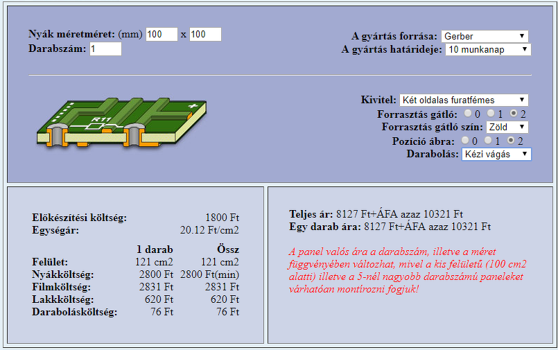 Nekem 5$-ért csinálták meg az egészet,amit mellékeltem,így 100db jött ki belőle.Rendeltem már vagy 20-25 féle panelt,5-6 volt panelizálva,egyikért sem kellett felárat fizetnem.Akkor kezdenek elszállni az árakkal,amikor több rétegre,vagy 10*10cm-panel főlé megy az ember .