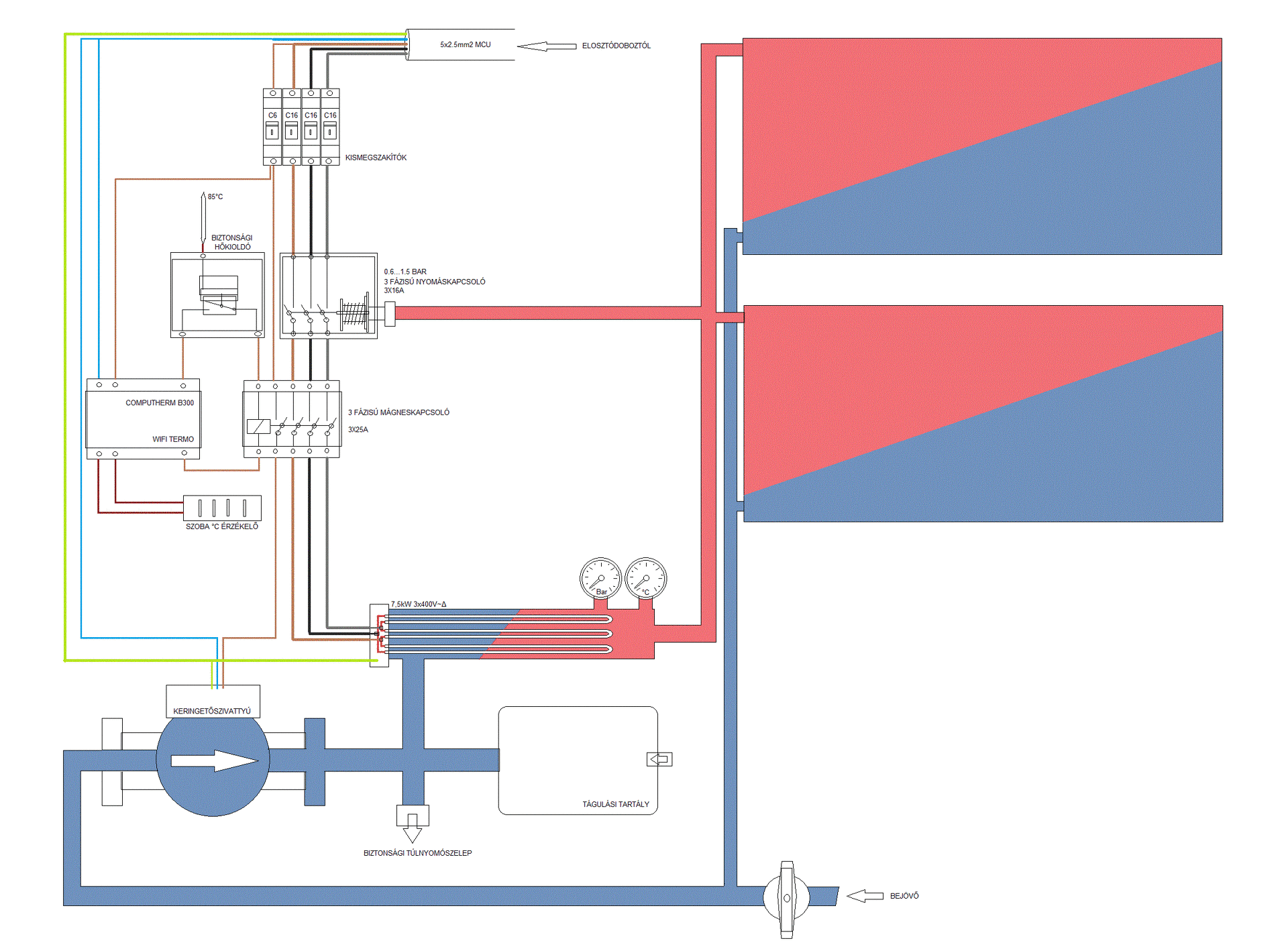 Bojler hőfokszabályzó, sorba kötve a nyomásszabályzóval és egy relének egy zárókantaktusa a 3 fázisú mágneskapcsoló tekercsével. A szobatermosztát meg kapcsolná a szivattyút és a relé tekercsét.