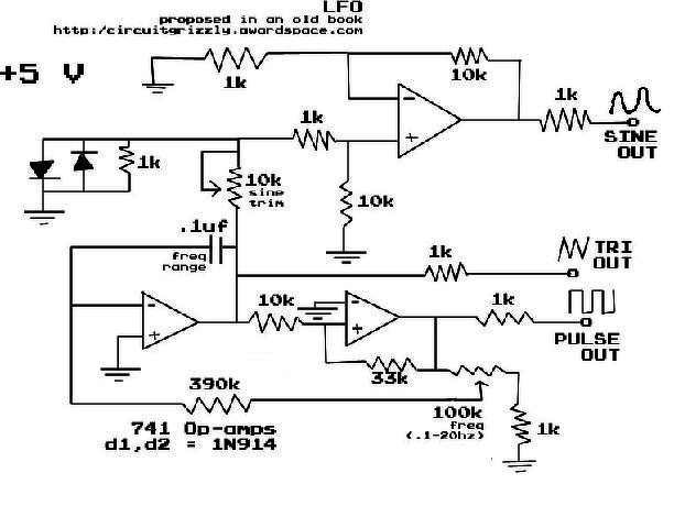 Hello! Az áramkör működéséhez kettős tápfeszültség szükséges. 5V táplálás és 741-es OPA nem jó választás. A "szinusz" jelet a háromszögjel diódával történő határolásából nyeri. Ami csak erős jóindulattal nevezhető szinusz feszültségnek és a háromszögjelnek legalább 1..2V-nál nagyobbnak kell lenni, hogy a határolás egyáltalán létrejöjjön.