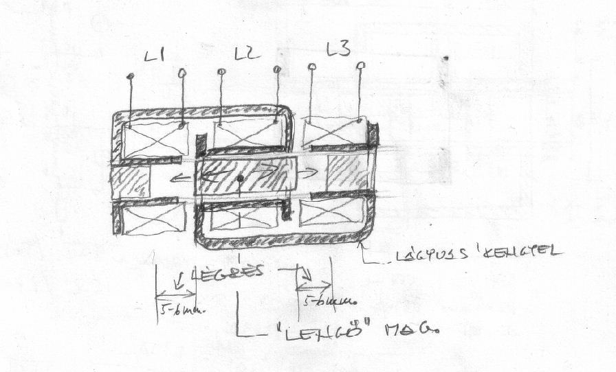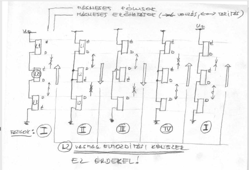 Mint említettem, ez egy kísérlet. Tulajdonképpen egy elektromágnes vasmagjának alternáló mozgását akarom a leghatékonyabban munkára fogni. Számoltam, méreteztem rengeteget, míg végtére arra az elhatározásra jutottam se képlet, se számolás, ezt ki kell próbálni. A mágneses körökről, működési fázisairól mellékelem vázlatrajzomat. Az L2 tekercs polaritásának váltásához- rövidzárásához gondoltam a H-hidat. Gondotam, mielőtt nekifogok tekercselni, megkérdezlek Titeket- nem- e 'agyrém az egész. Ha mégis az, akkor 'agyalásnak jó volt. Tisztelettel, és megköszönöm pro-kontra véleményeiteket. Idézet: Éppen ellentétes hatást fogsz elérni azzal, ha az elektromágnes tekercsét rövidre zárod.„egy elektromágnes vasmagjának alternáló mozgását akarom a leghatékonyabban munkára fogni.” A rajzodon a kettes és négyes fázis ábrázolása hibás. A rövidre zárt tekercsen nem folyik áram, nincs benne mágeses mező, közömbös lesz az alső és felső mágnesre, nem hat rá semmilyen vonzó vagy taszító erő (eltekintve a vasmag hatásától).