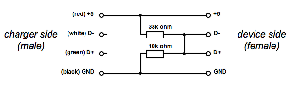 A D+ és D- lábakkal lehet megmondani a telefonnak, mekkora árammal számolhat az aktuális tápegységtől. Ehhez a telefon gyári töltőjét kell megnézni vagy infót keresni valahonnan. Mint a mellékelt ábrák is mutatják, ez telefononként eltérő.