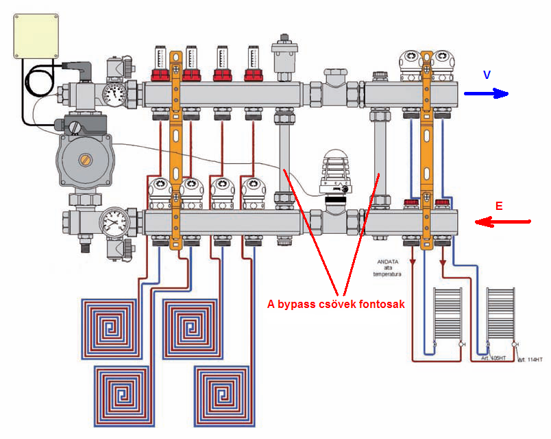 ..ahogy meg is találtad és linkelted a leírást hozzá.. Ugyanazt csinálja egy 100% hatékonyságú hőcserélő is, csak a padlófűtés két szeleppel teljesen leválasztható legyen ha a tél közepén meghibásodik / kilukad a padlóspirál (ezt szolgálja a hőcserélő is) a radiátorok tovább üzemelhessenek.