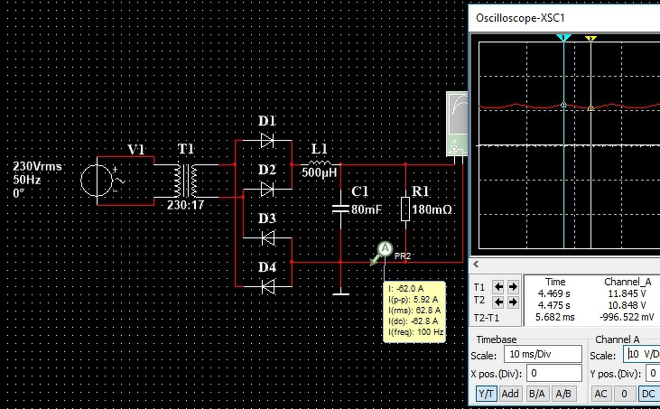 A szimuláción szépen látszik, hogy 63A környékén 80mF kondival mindössze 1V-ot hullámzik a feszültség, és az áram is csak 10%-ot ingadozik, 59 és 65A között. Szóval messze jobb ez mint sokan gondolnák, csak méretezés meg trafókészítés kérdése. Azaz lehet nagyon jót meg nagyon rosszat is csinálni trafóval, 1 fázisra is. A szimulációban már a trafó hibái is benne vannak, mert raktam bele szórási induktivitást és belső ellenállást is.