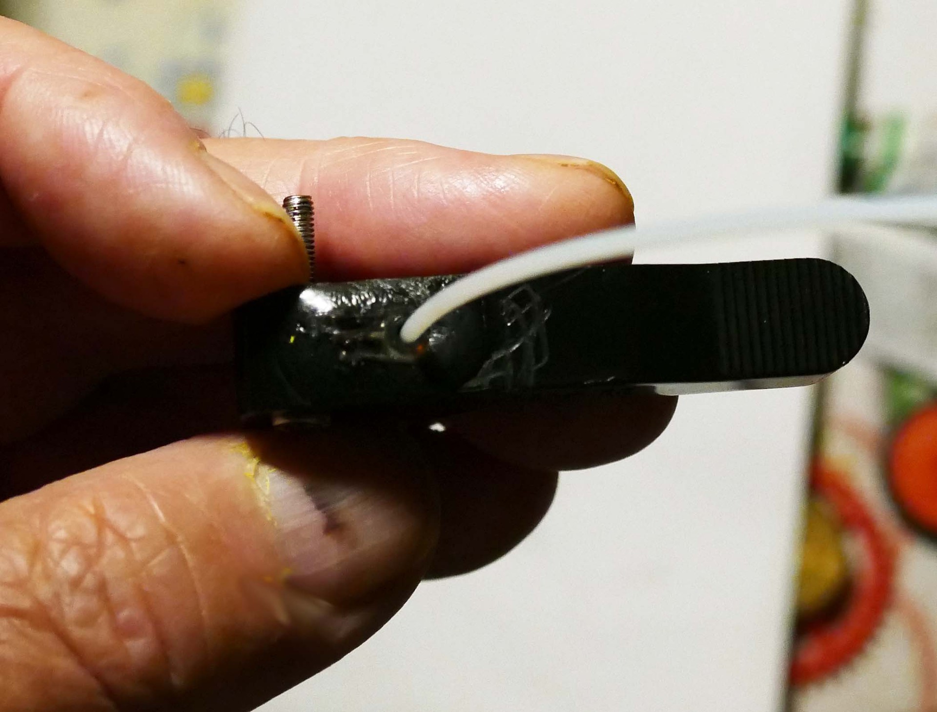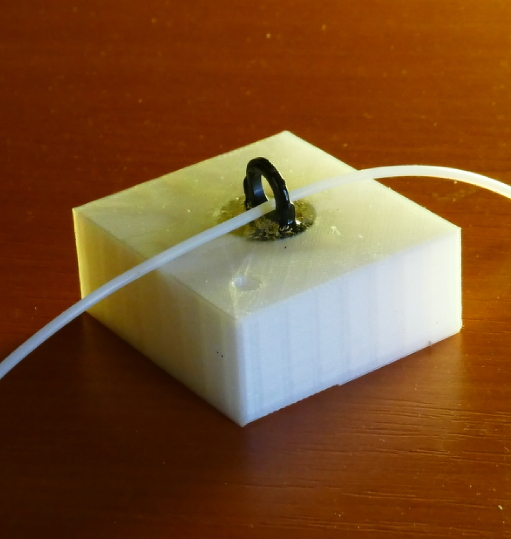 A 3 D nyomtató fórumokon többször találkoztam azzal a problémával, hogy filament bemeneti nyílását kikezdi a filament. A peca boltokba lehet kapni 2mm belső lyukú PORCEÁN damil vezetőt gyűrűt 300Ft alatt. 5 perces két komponensű UVERAPID ragasztóval ragasztottam fel a gyűrűt a filement lyuk bejáratra. A ragasztás idejére a lyukat, átgyúrt kenyér galacsinnal töltöttem fel, mert hirtelen nem volt más itthon. (rágógumi, is jó lehet) A felületet össze vissza megkarcoltam, hogy a ragasztó jól tapadjon. A fekete porcelán gyűrű, egy fém gyűrűbe van applikálva, aminek több csápja van a mi botra erősítéshez kellett eredetileg. Ezeket el csíptem, és a maradék drótokat és óvatosan egy síkra kiterítettem mint ha csápok lennének. Ezeket a drót csápokat jól befuttattam ragasztóval.
