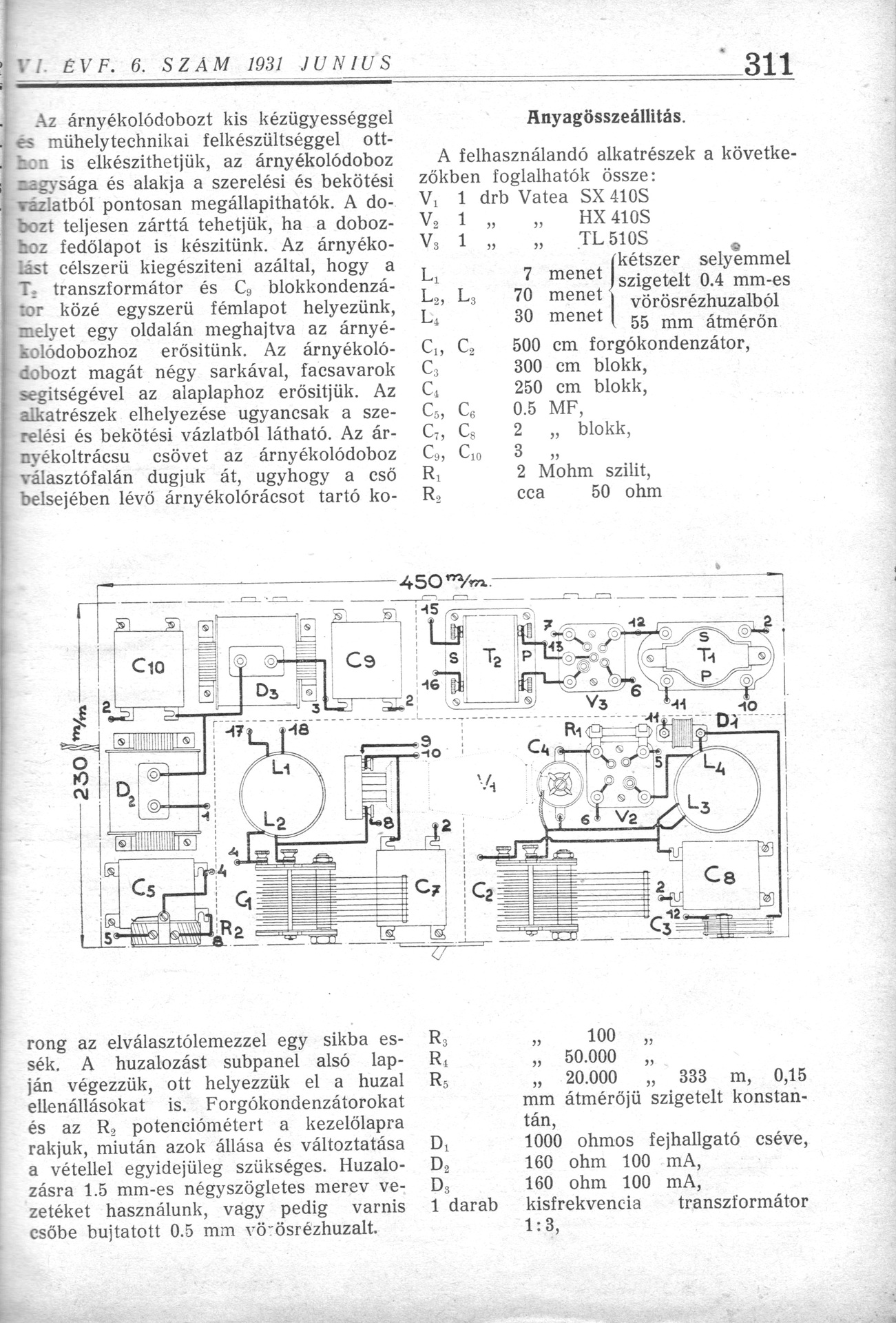A kis nyilas gomb a visszacsatolás, a nagyobb a hangolás. Mindkettő 500 cm (1pF=0,9cm) kapacitású bakelit-szigetelésű forgókondenzátor. (A Fentebb közölt Rádió és Fotó amatőr 1931 Júniusi számából. ) Viszonylag lassan készítettem, sokáig tartott, mire megfelelően lerendeztem az alkatrészeket, kb 4 hónapomba tellett, a végén már gyorsítottam, mert a TDK-ra időre működőképessé kellett tennem.